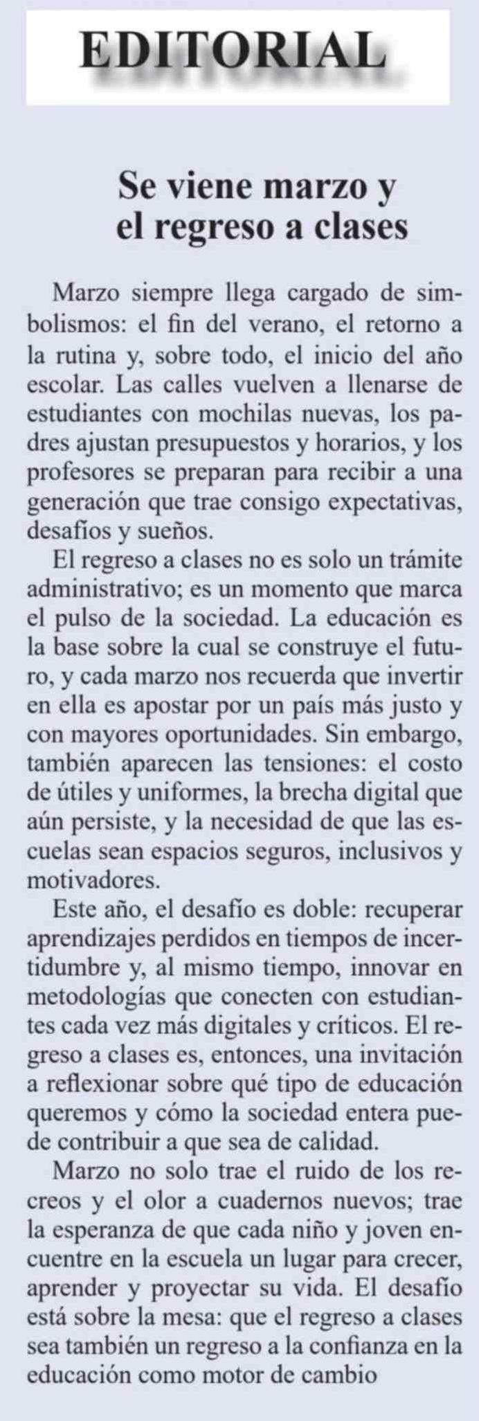 | Título: | Editorial: Se viene marzo y el regreso a clases |