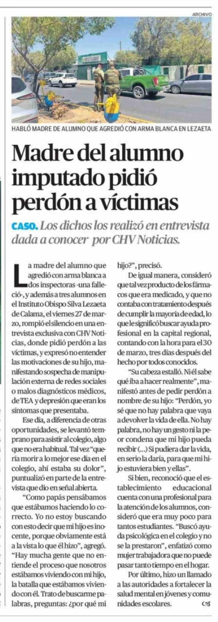 Madre del alumno imputado pidió perdón a víctimas 21-04-2026 El Mercurio de Antofagasta |