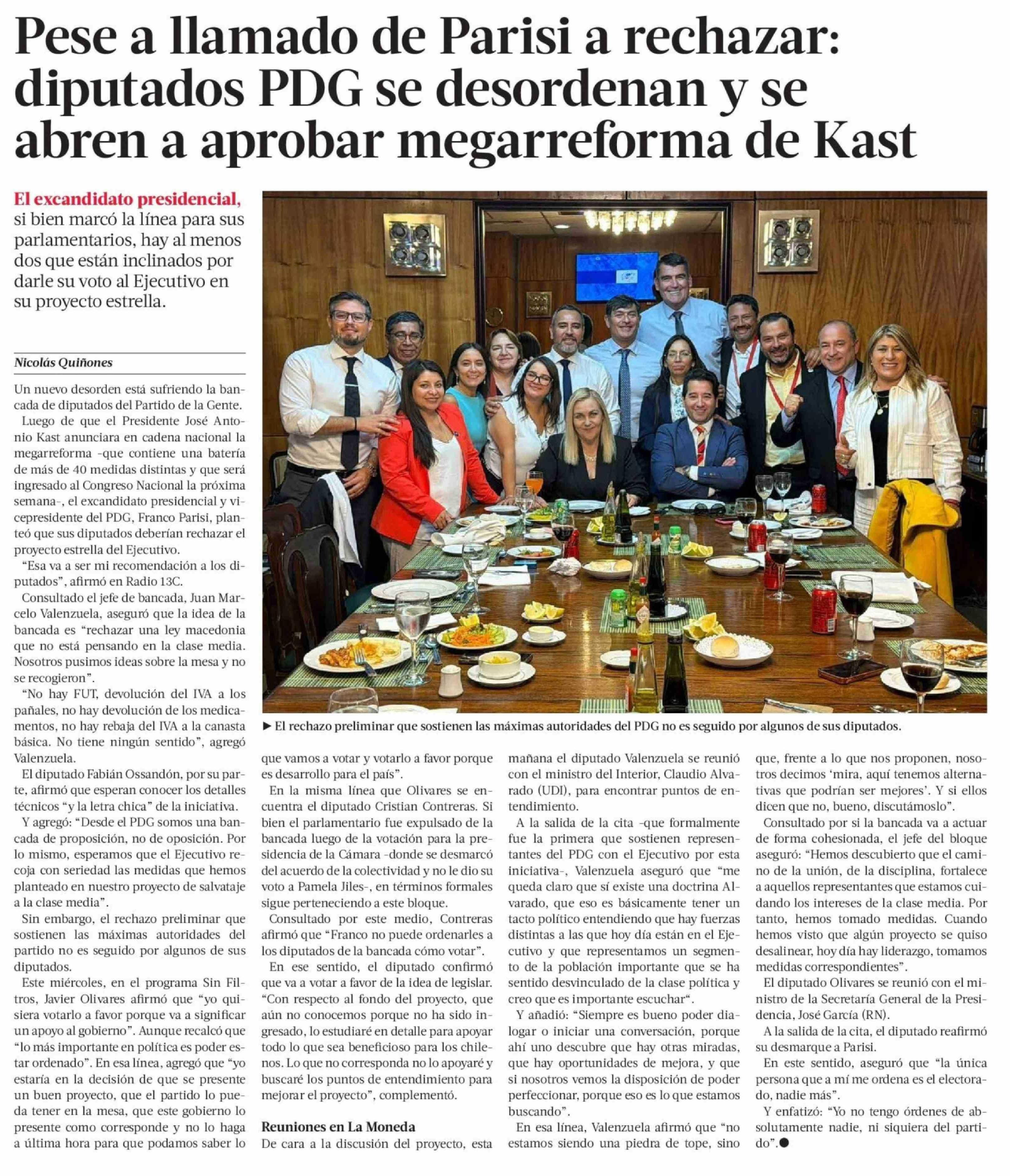 Pese a llamado de Parisi a rechazar: diputados PDG se desordenan y se abren a aprobar megarreforma de Kast 17-04-2026 La Tercera |