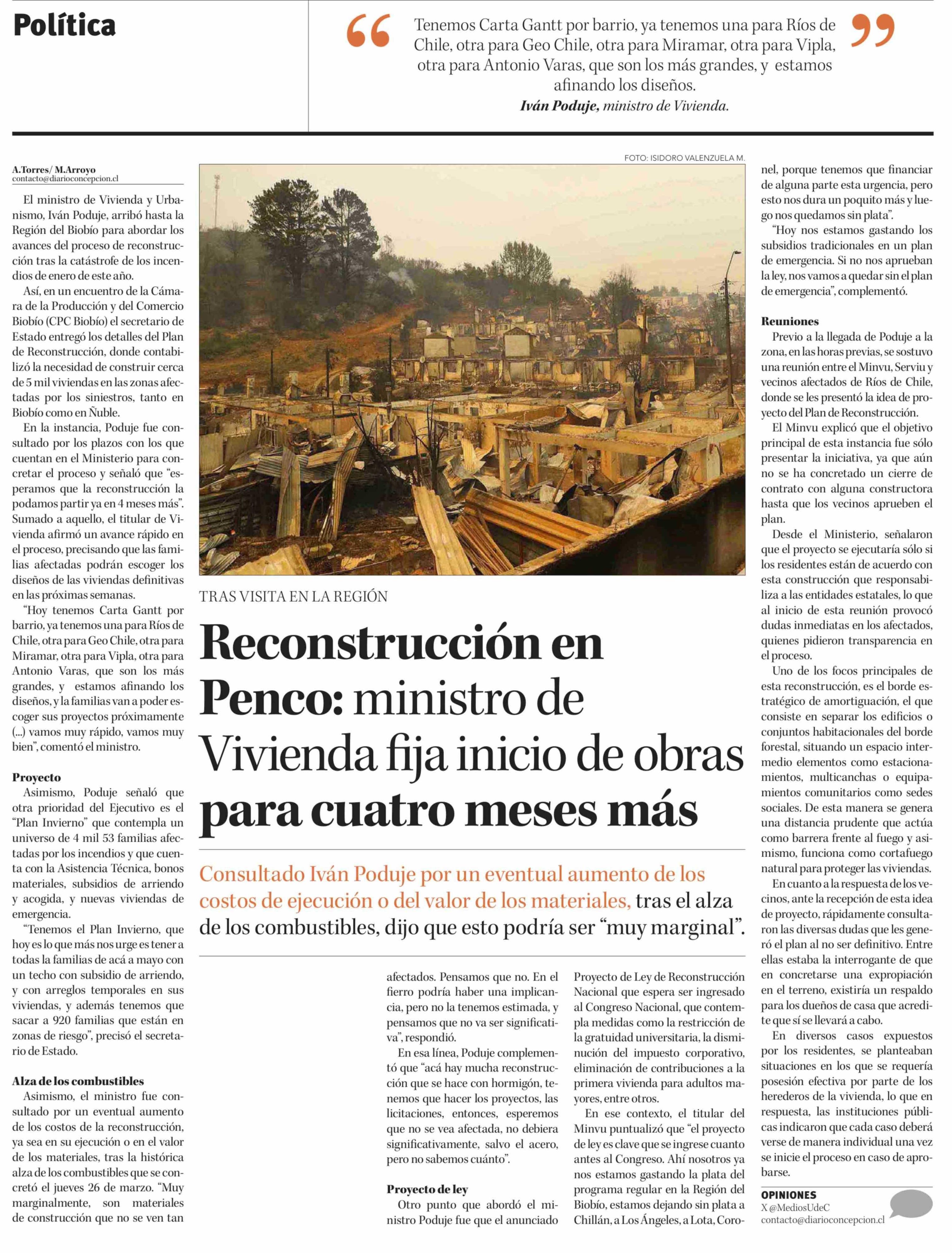 | Título: | Reconstrucción en Penco: ministro de Vivienda fija inicio de obras para cuatro meses más |