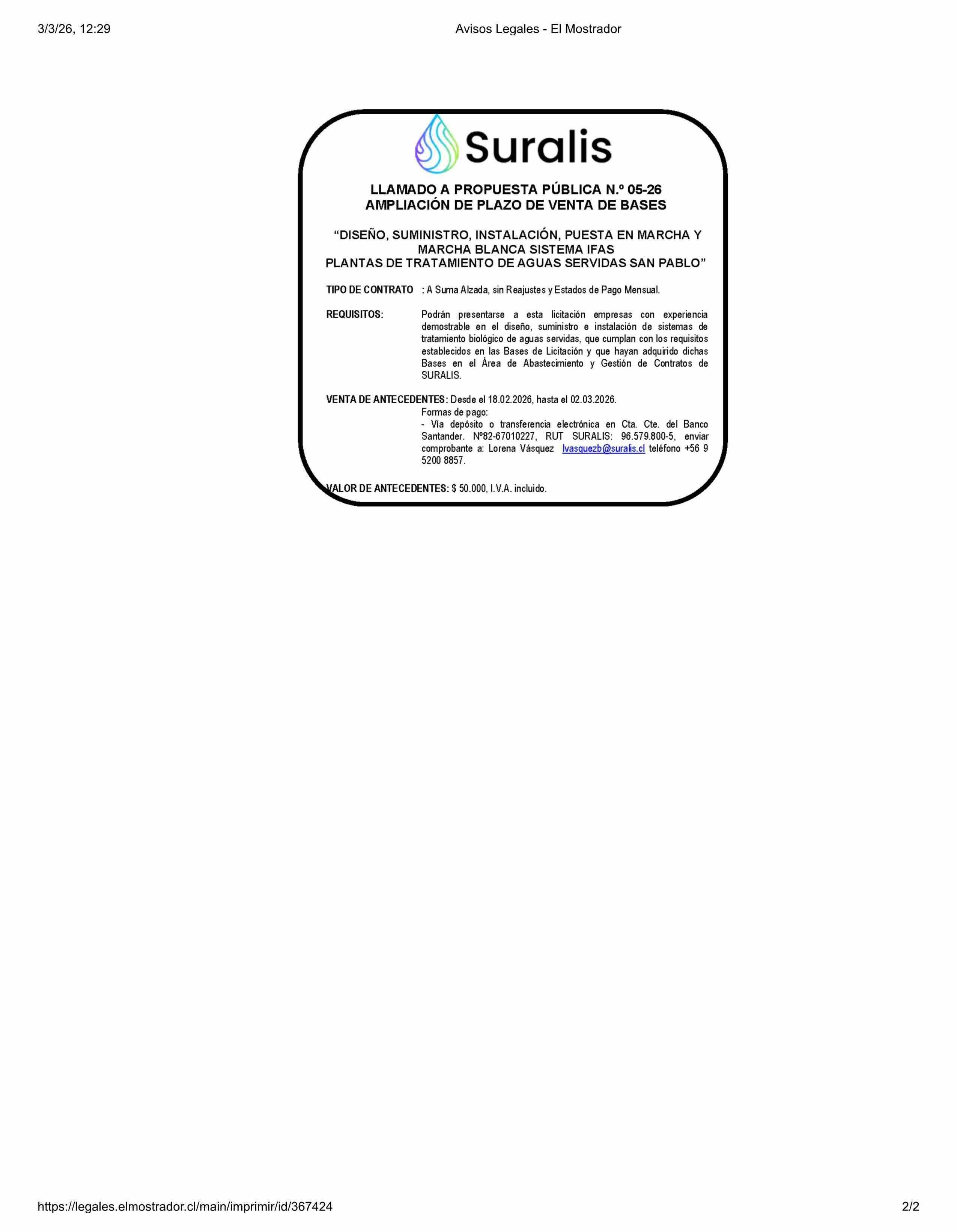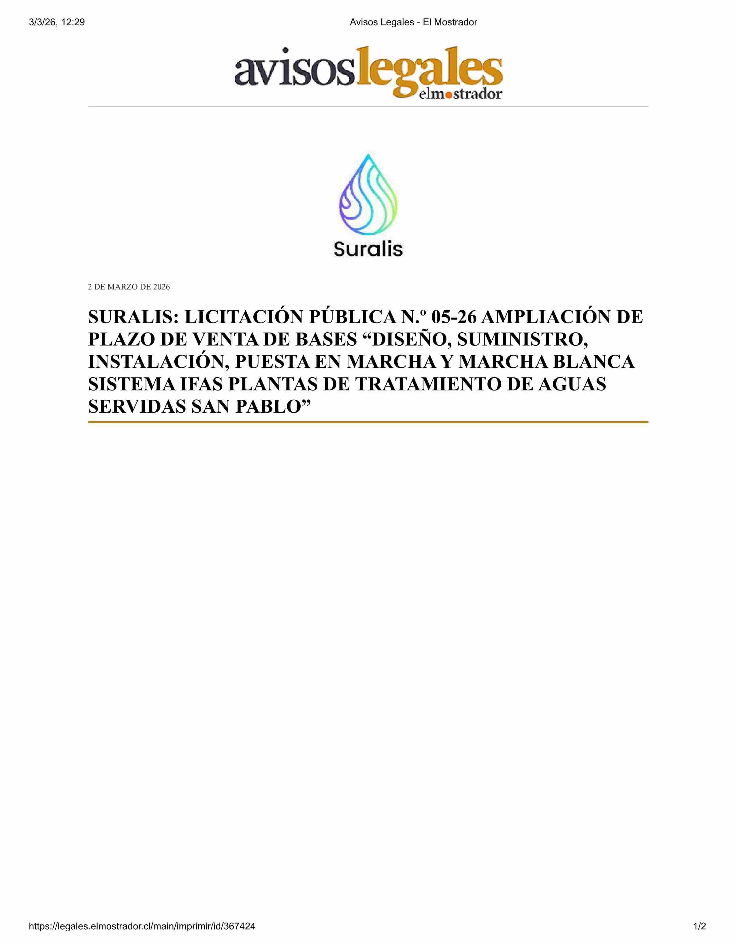 Título: AVISO LICITACIONES: SURALIS LICITACIÓN PÚBLICA N.* 05-26 AMPLIACIÓN DE PLAZO DE VENTA DE BASES “DISEÑO, SUMINISTRO, INSTALACIÓN, PUESTA EN MARCHA Y MARCHA BLANCA SISTEMA IFAS PLANTAS DE TRATAMIENTO DE AGUAS SERVIDAS SAN PABLO”