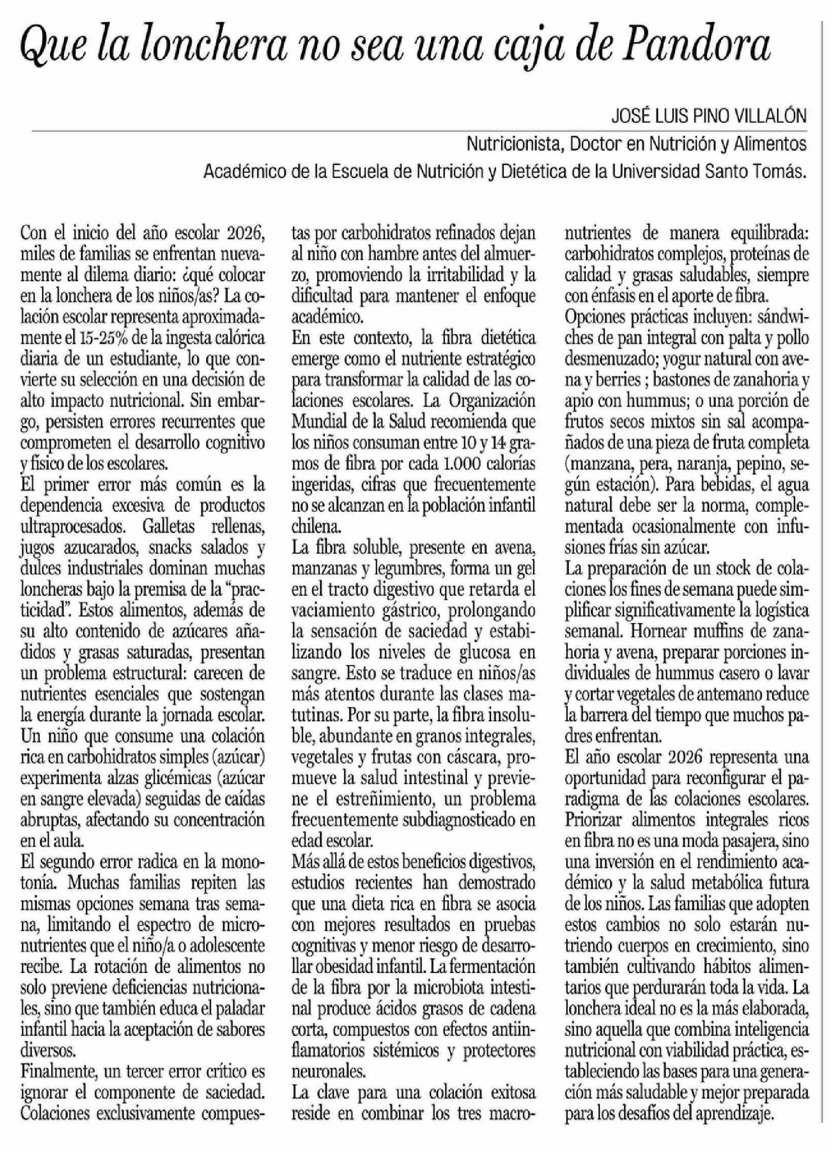 Cartas: Que la lonchera no sea una caja de Pandora 27-02-2026 La Prensa de Curicó |