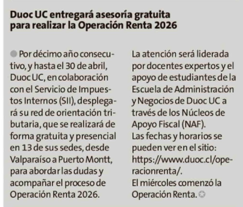 | Título: | Duoc UC entregará asesoría gratuita para realizar la Operación Renta 2026 |