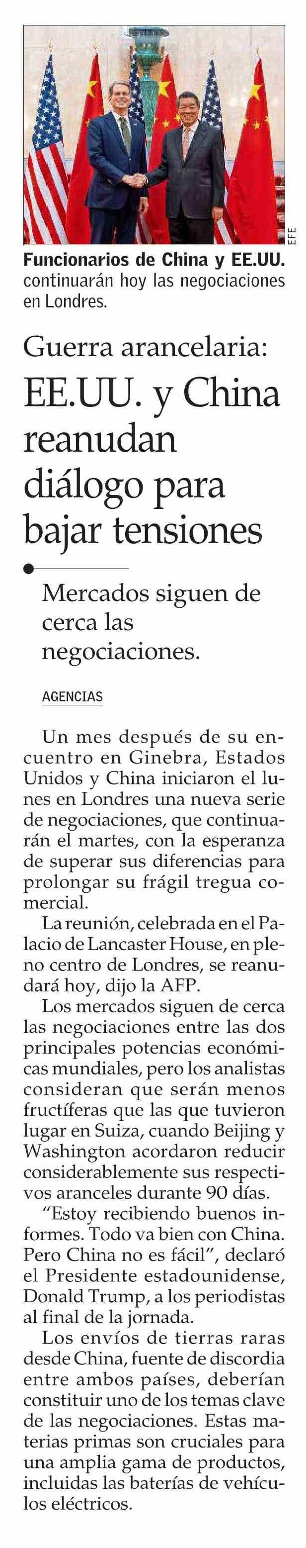 EE.UU. y China reanudan diálogo para bajar tensiones 10-06-2025 El Mercurio |