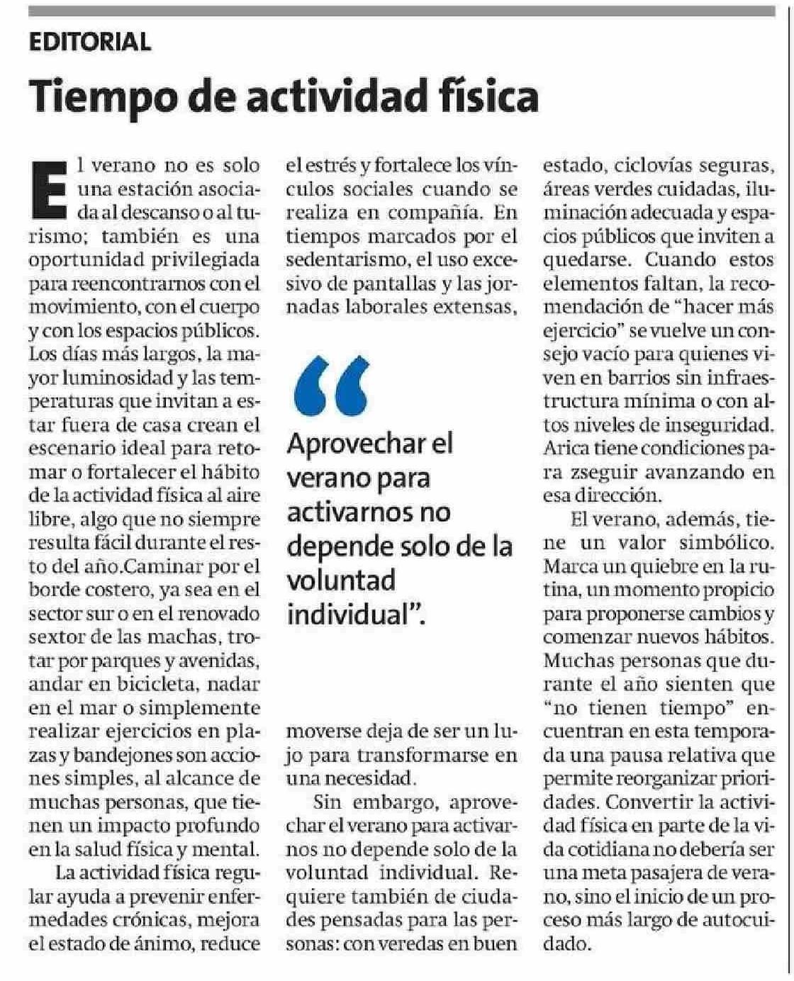 Editorial: Tiempo de actividad física 17-01-2026 La Estrella de Arica |