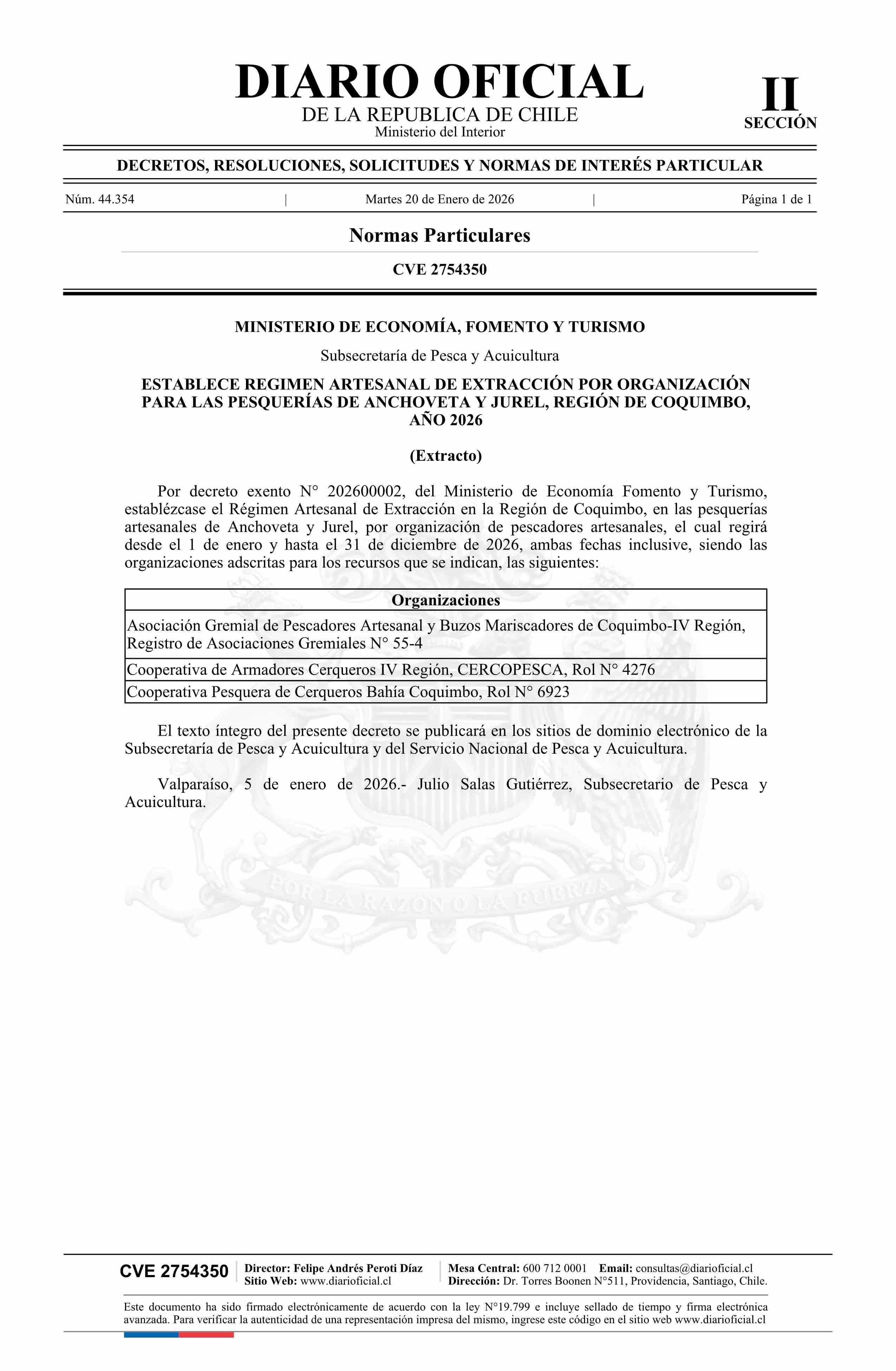 Extracto de decreto exento número 202600002, de 2026.- Establece régimen artesanal de extracción por organización para las pesquerías de Anchoveta y Jurel, Región de Coquimbo, año 2026 20-01-2026 Diario Oficial Edición Electrónica |
