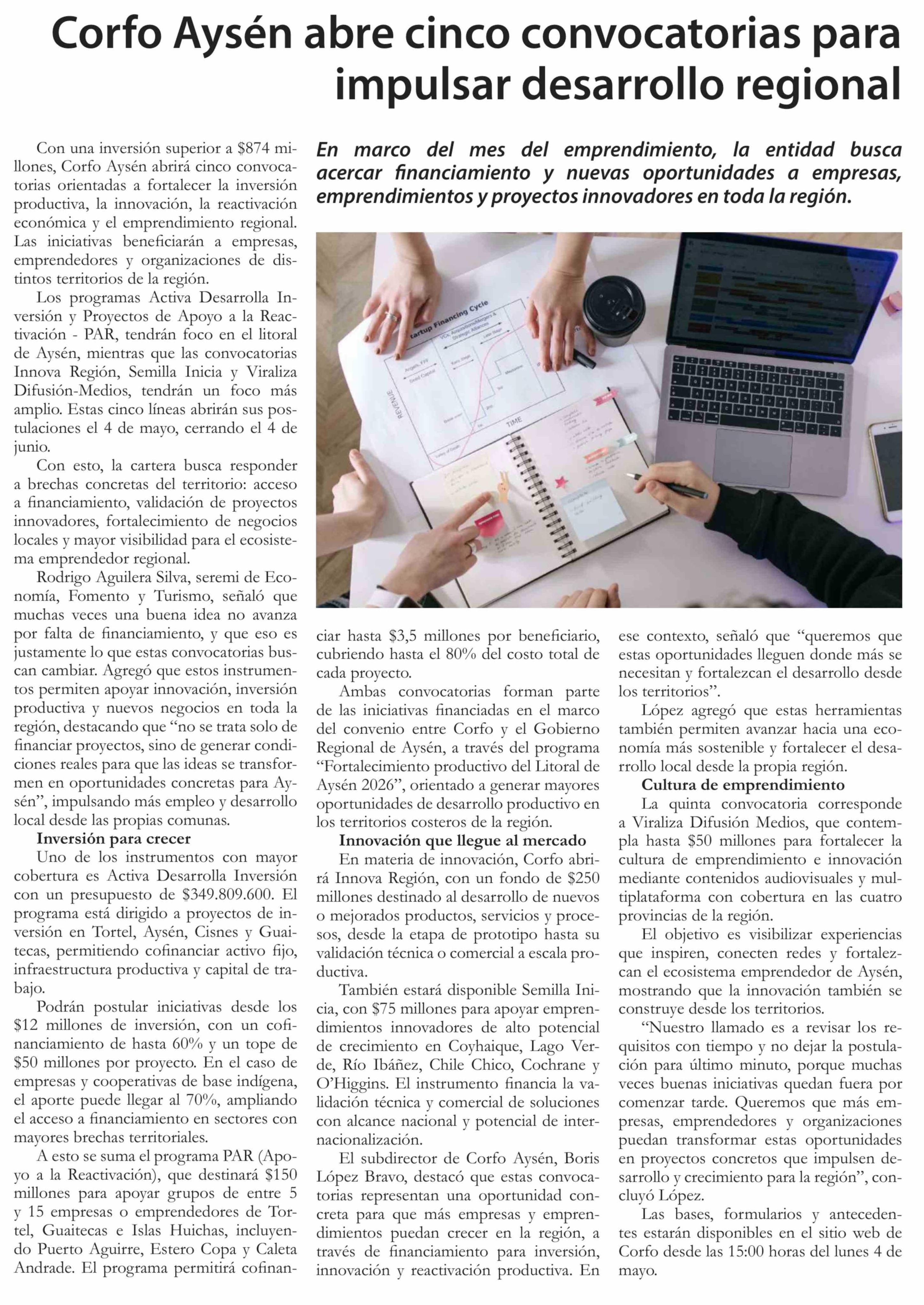 Título: Corfo Aysén abre cinco convocatorias para impulsar desarrollo regional