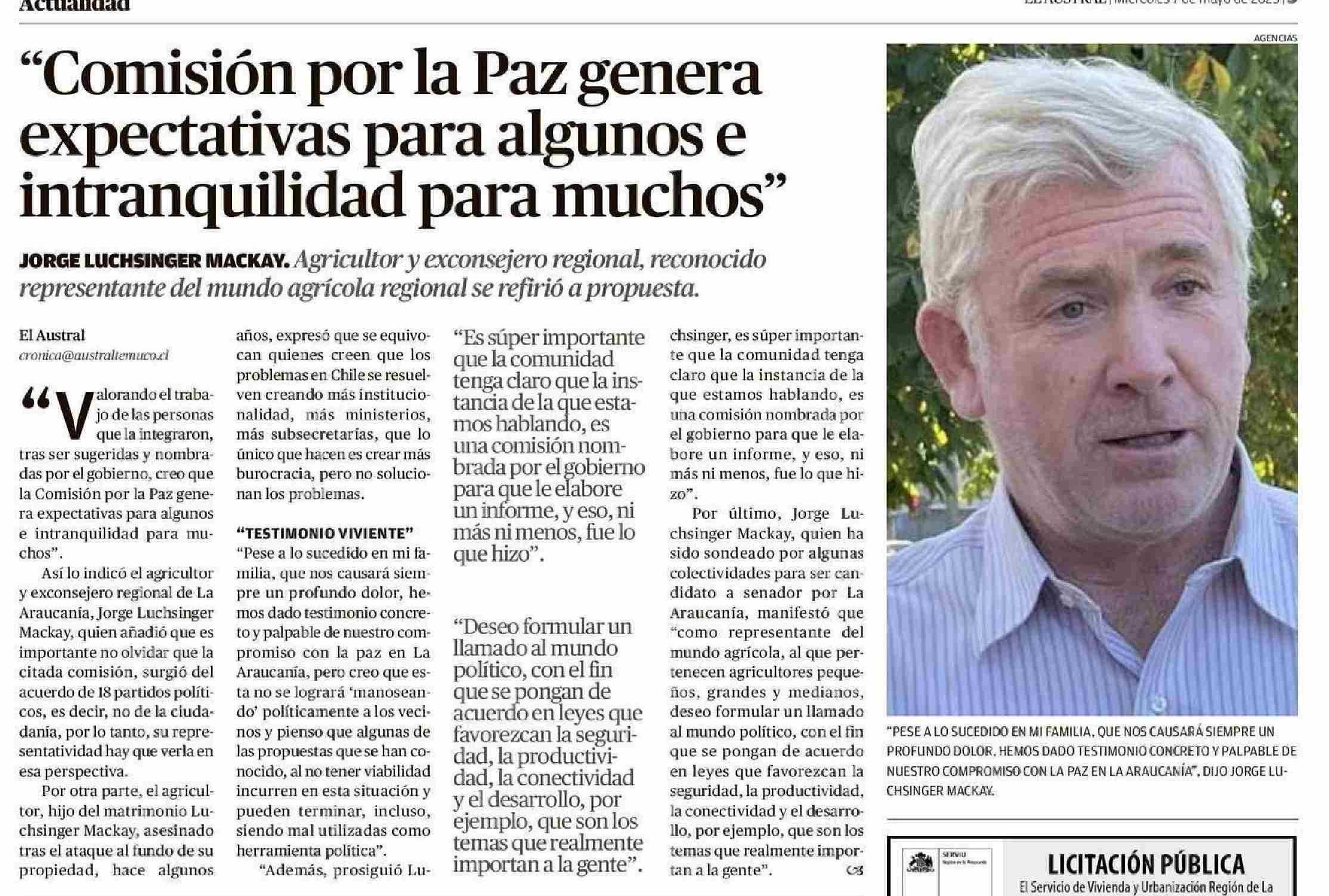 “Comisión por la Paz genera expectativas para algunos e intranquilidad para muchos” 07-05-2025 El Austral de la Araucanía |