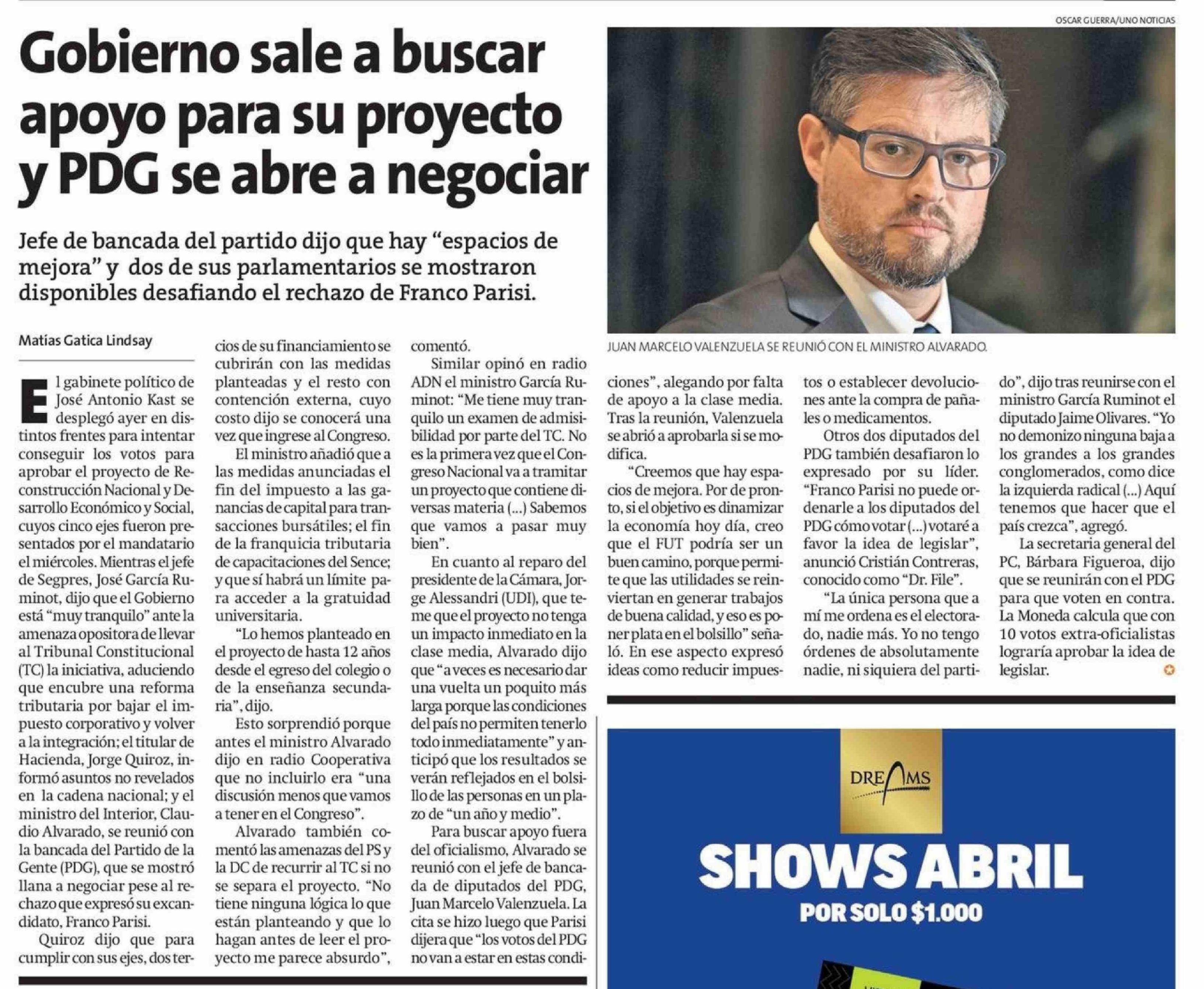 Título: Gobierno sale a buscar apoyo para su proyecto y PDG se abre a negociar