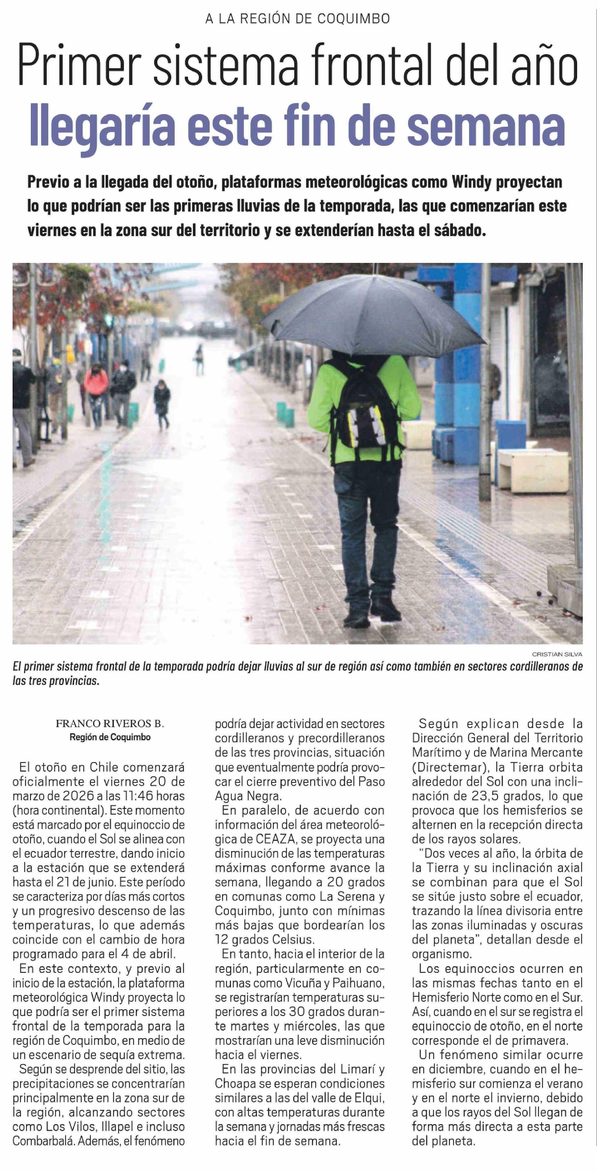 Primer sistema frontal del año llegaría este fin de semana 17-03-2026 El Ovallino |