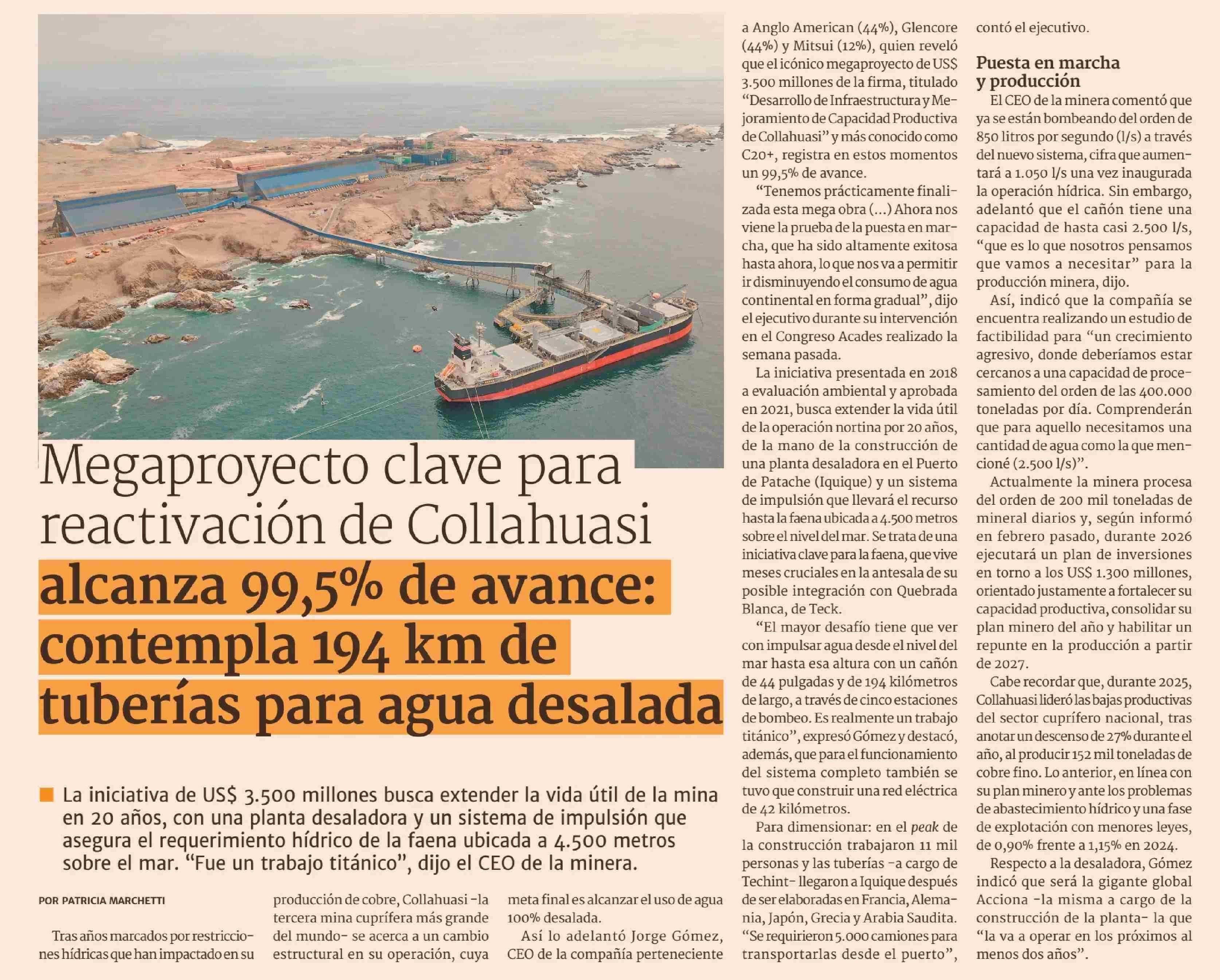 Título: Megaproyecto clave para reactivación de Collahuasi alcanza 99,5% de avance. contempla 194 km de tuberías para agua desalada