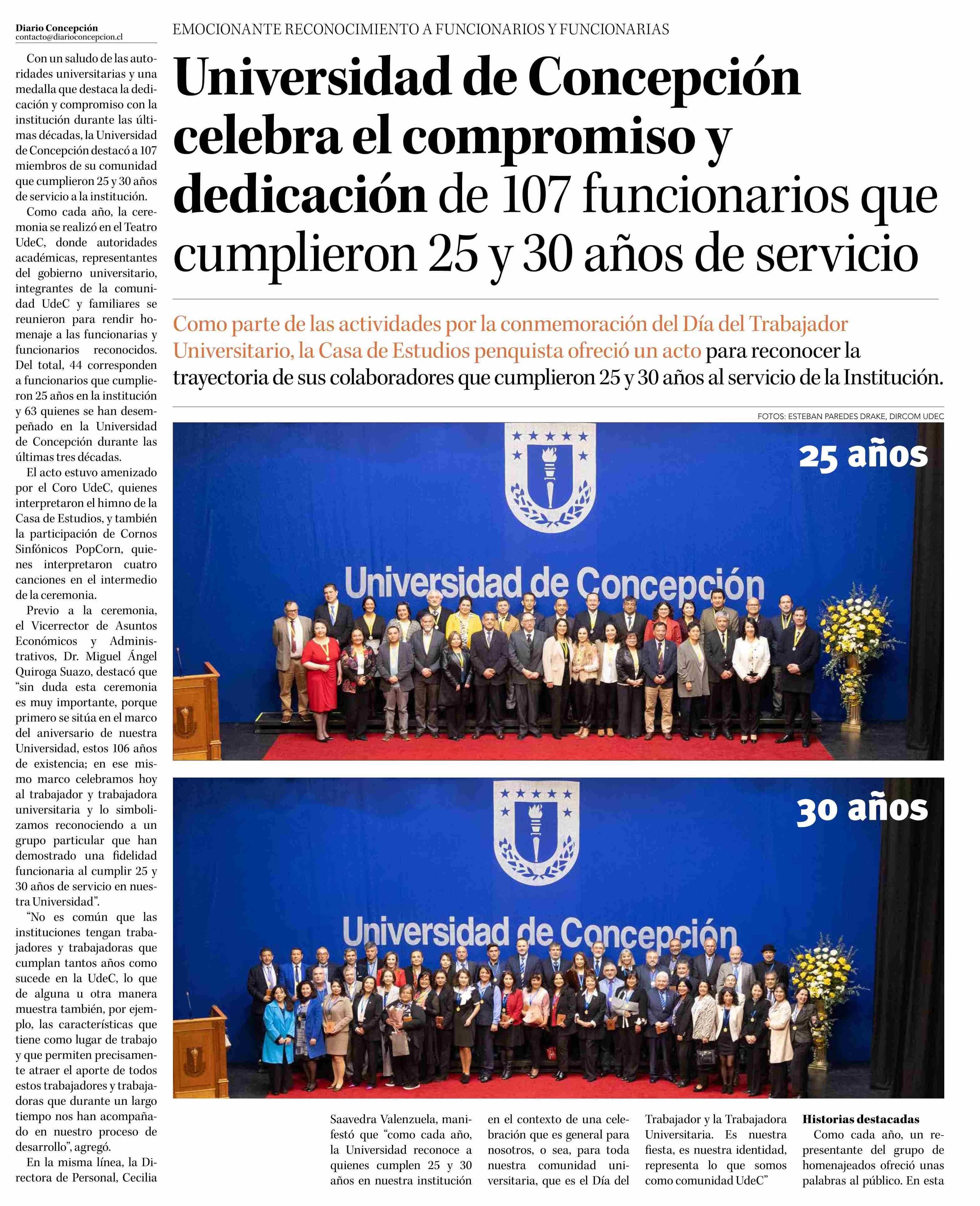 Universidad de Concepción celebra el compromiso y dedicación de 107 funcionarios que cumplieron 25 y 30 años de servicio 18-05-2025 La Discusión |