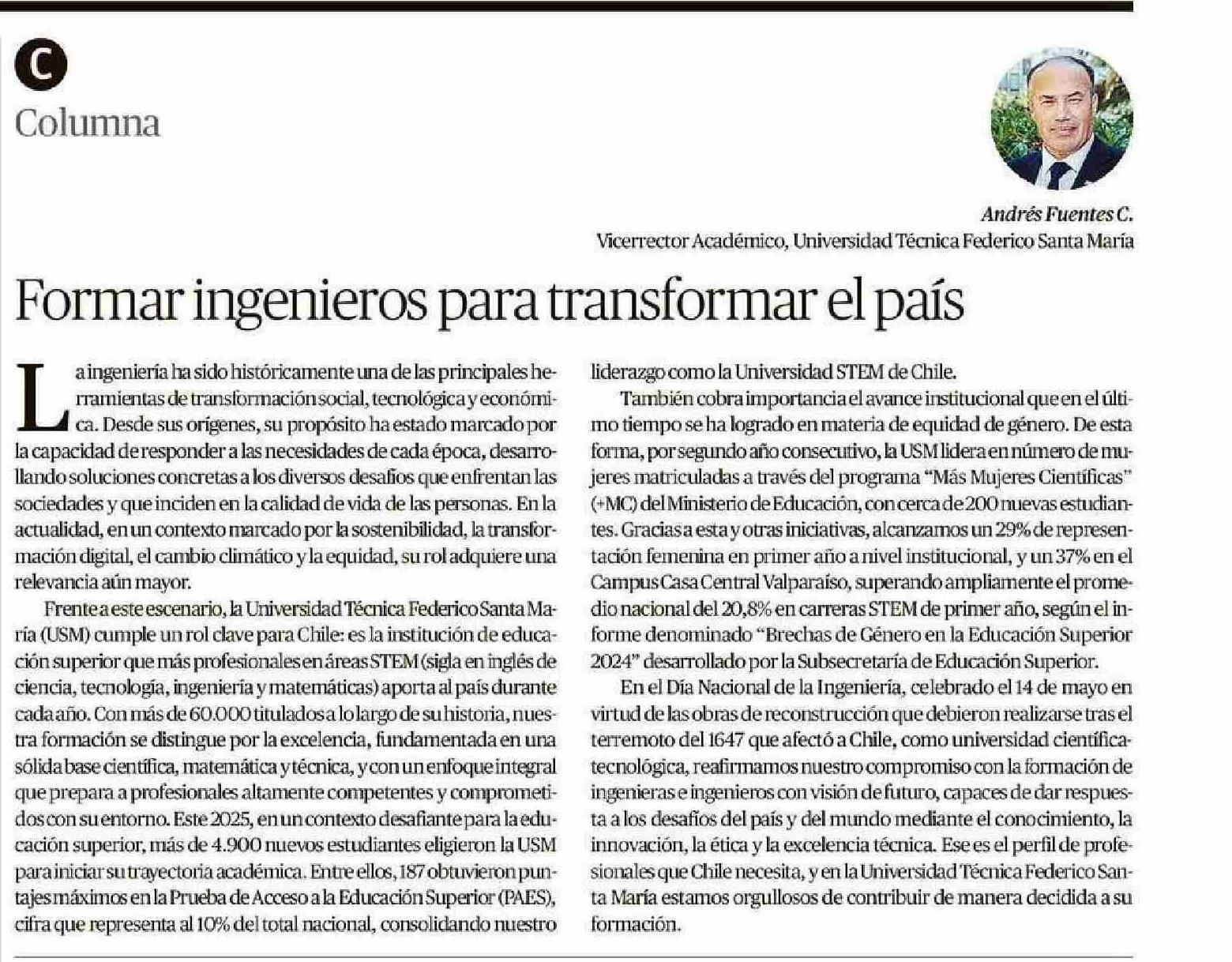 Formar ingenieros para transformar el país 15-05-2025 El Mercurio de Valparaíso |