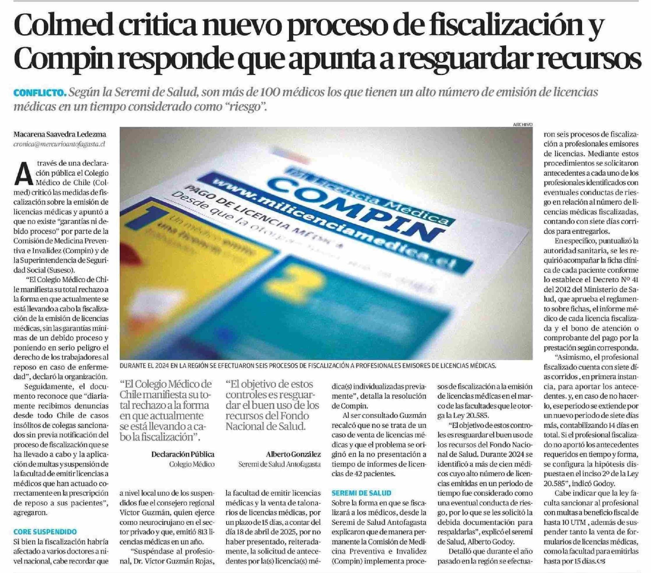 Colmed critica nuevo proceso de fiscalización y Compin responde que apunta a resguardar recursos 24-04-2025 El Mercurio de Antofagasta |