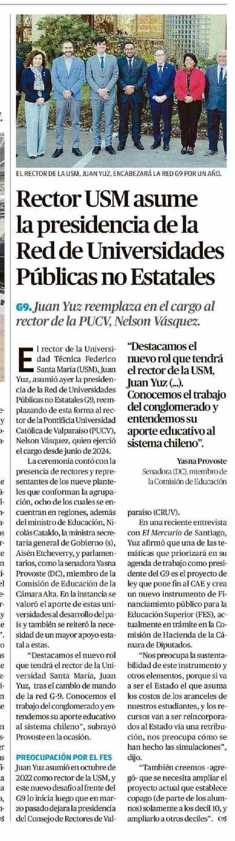 Rector USM asume la presidencia de la Públicas no Estatales Red de Universidades 10-06-2025 El Mercurio de Valparaíso |