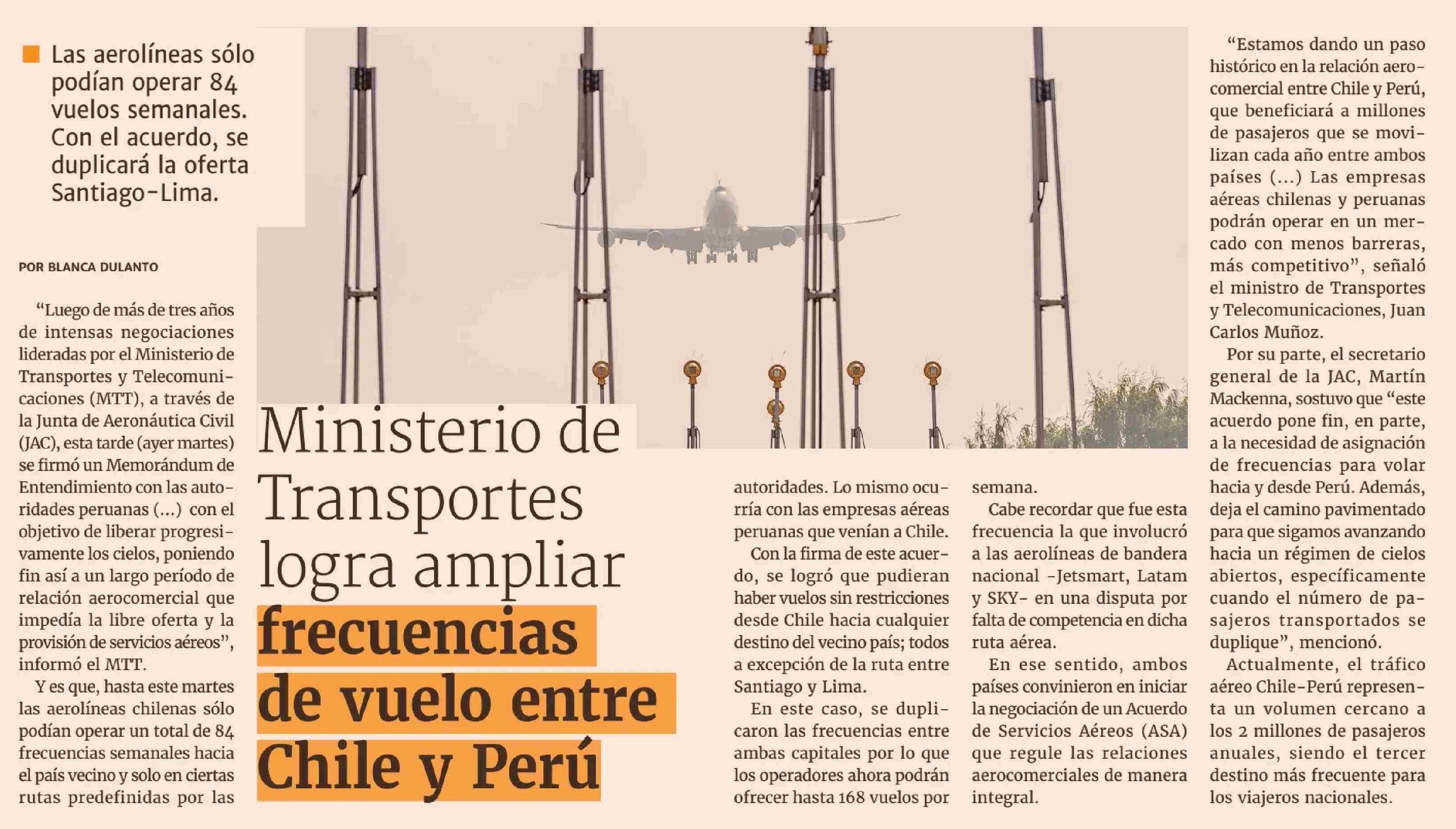Título: Ministerio de Transportes logra ampliar frecuencias de vuelo entre Chile y Perú