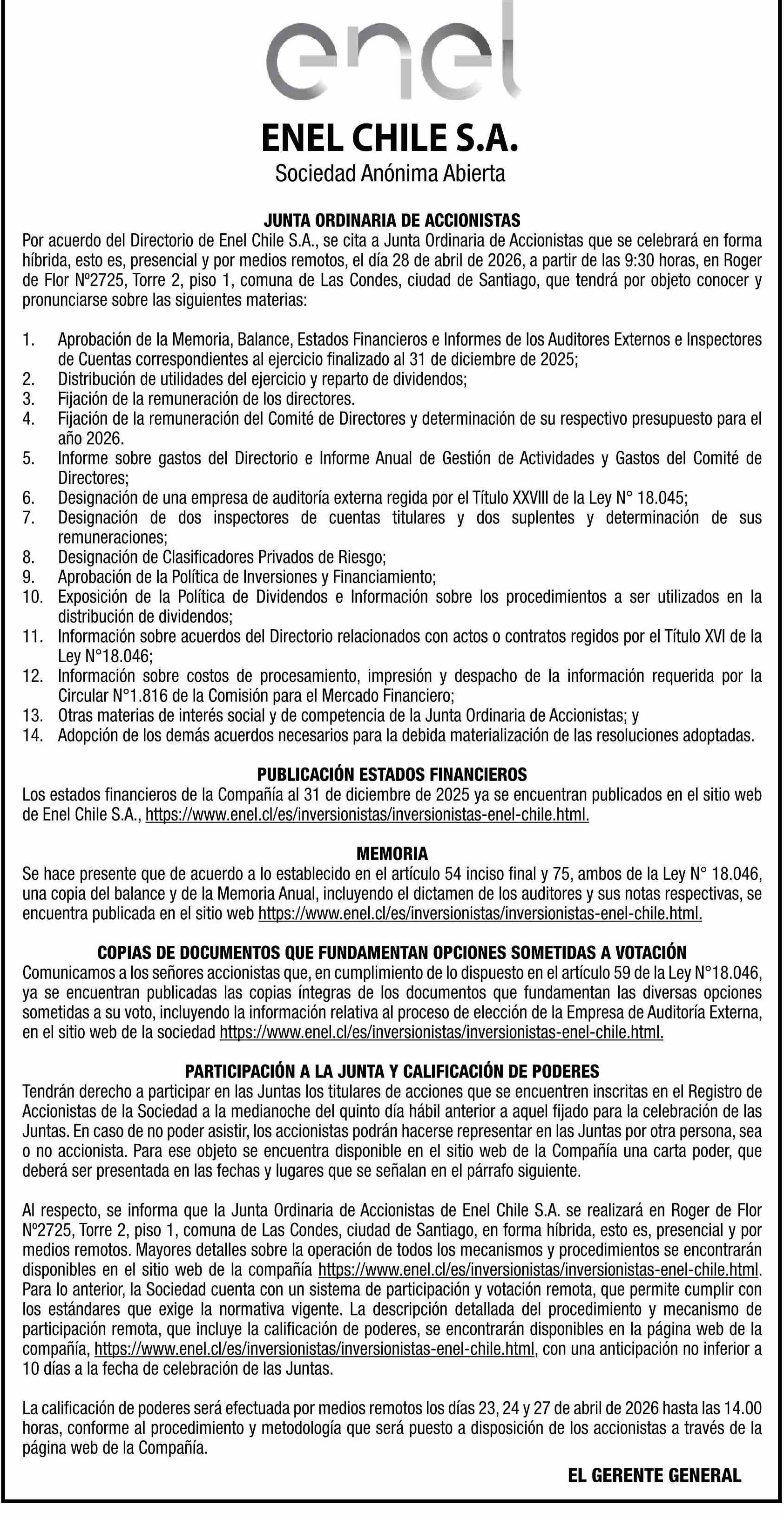 Extractos: ENEL CHILE S.A. 13-04-2026 El Mercurio |