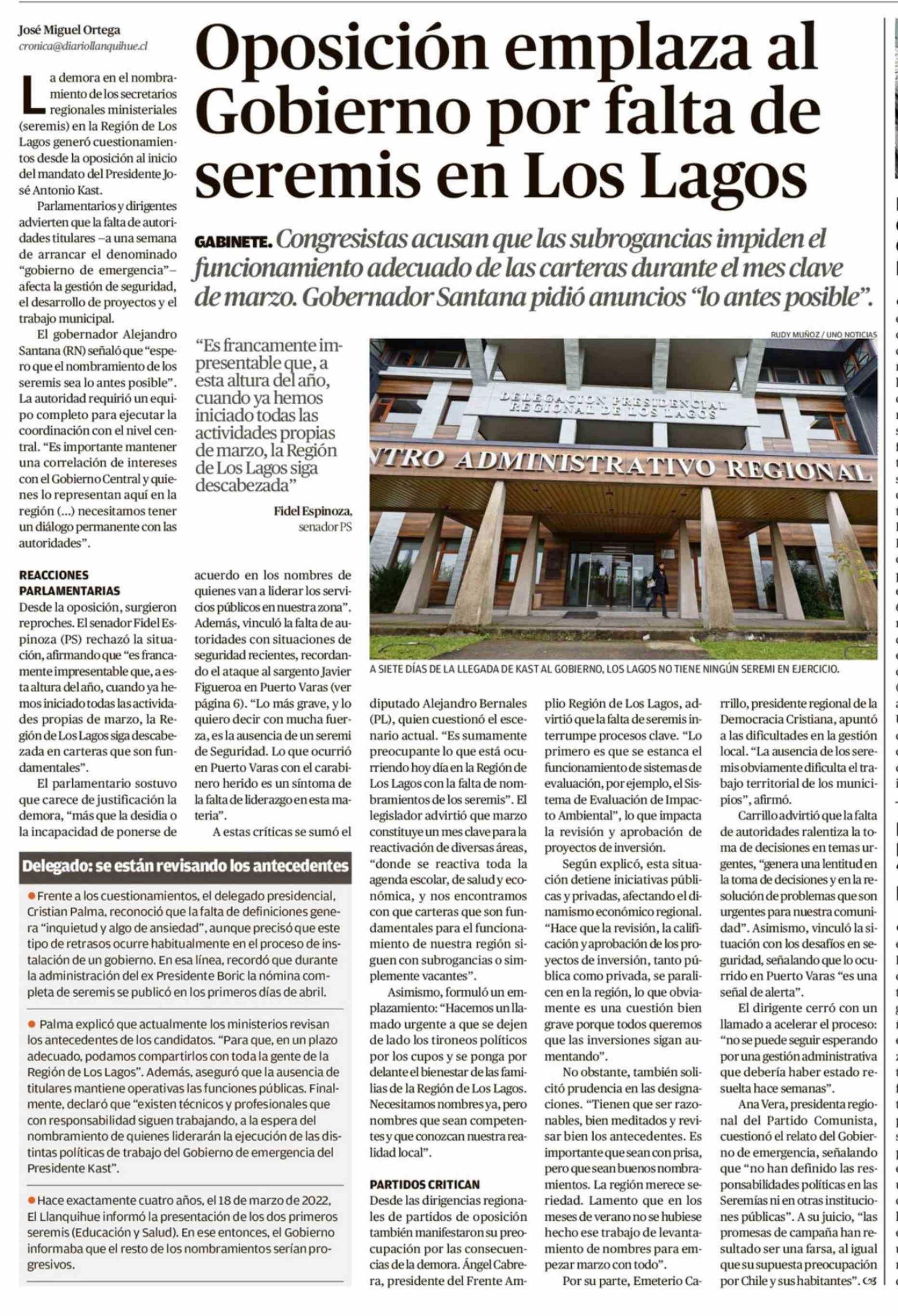 Oposición emplaza al Gobierno por falta de seremis en Los Lagos 18-03-2026 El Llanquihue |