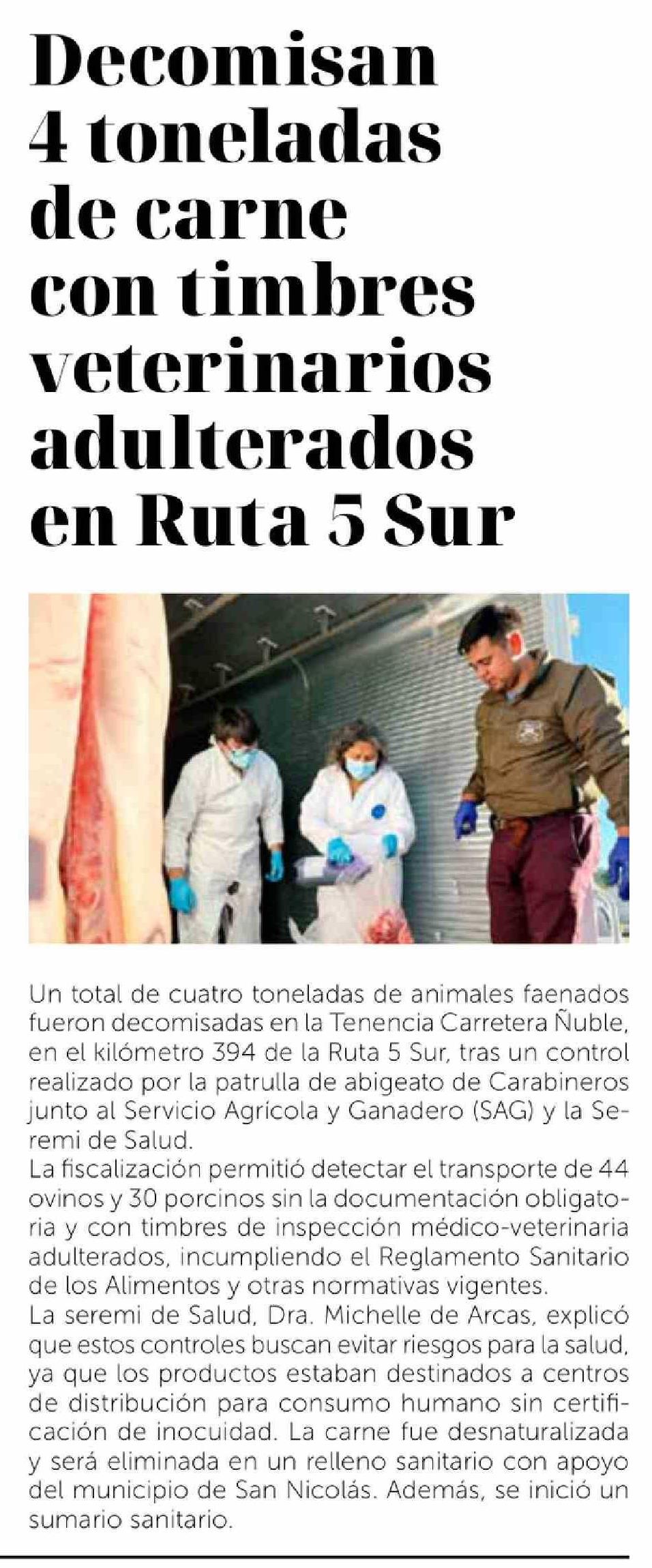 | Título: | Decomisan 4 toneladas de carne con timbres veterinarios adulterados en Ruta 5 Sur |