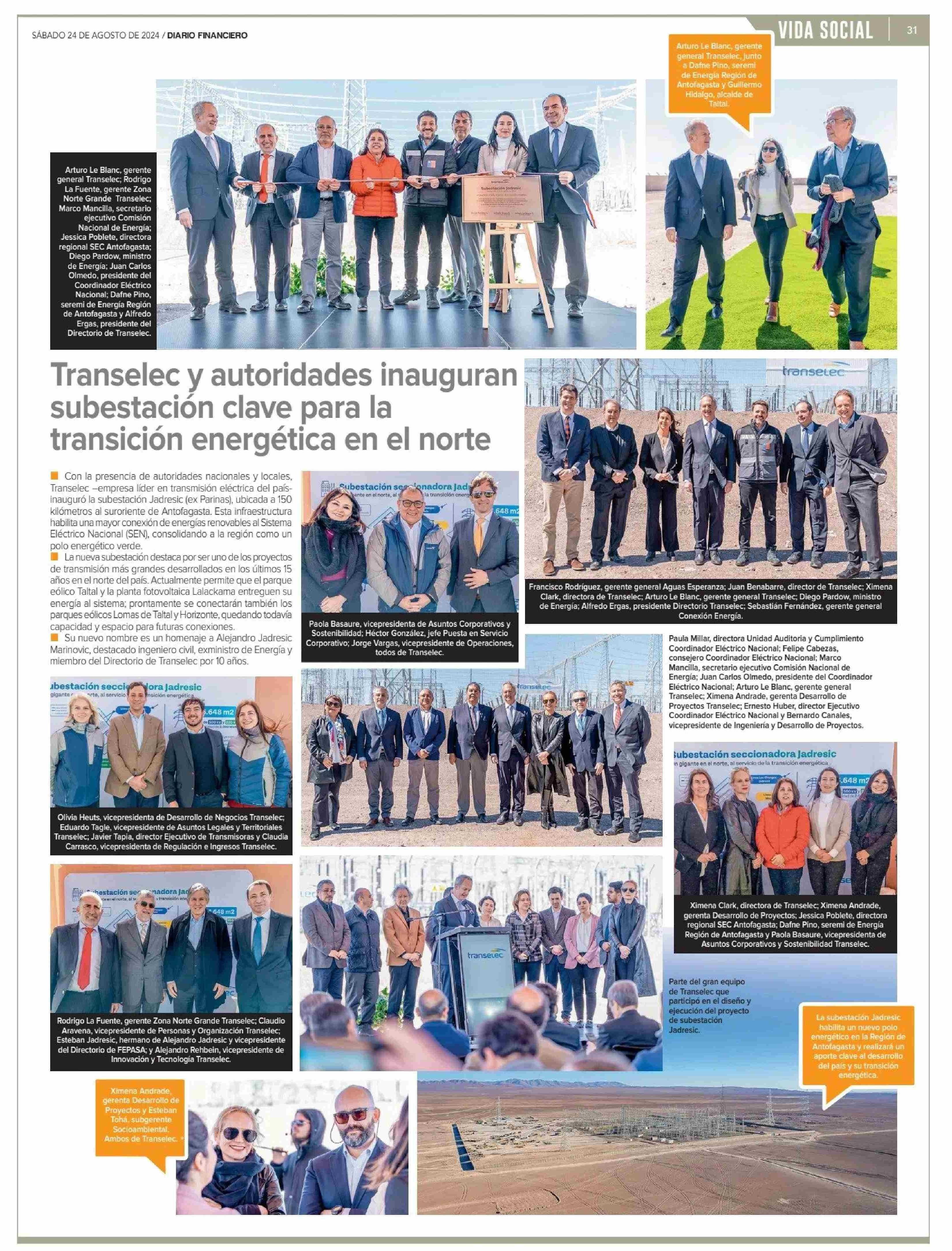 Transelec y autoridades inauguran subestación clave para la transición energética en el norte 24-08-2024 Diario Financiero |