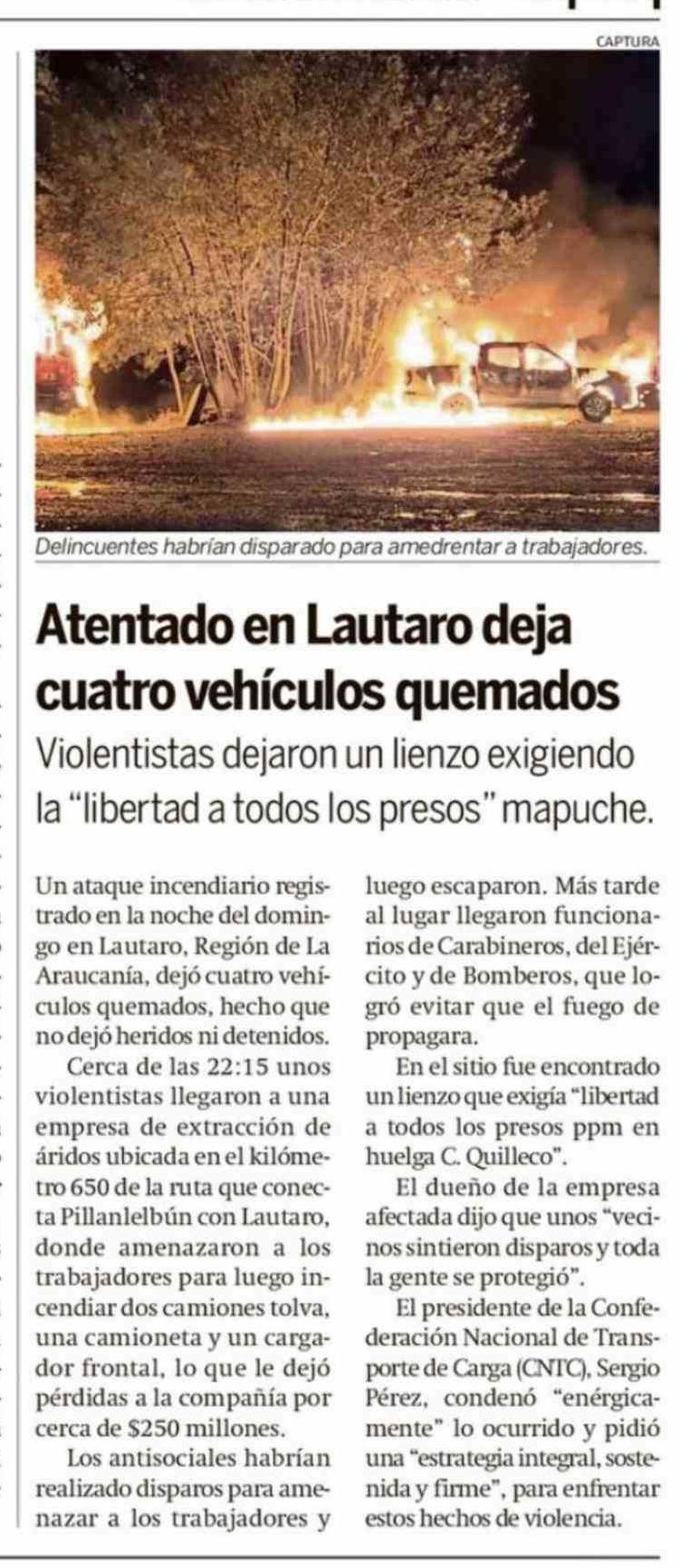 Título: Atentado en Lautaro deja cuatro vehículos quemados