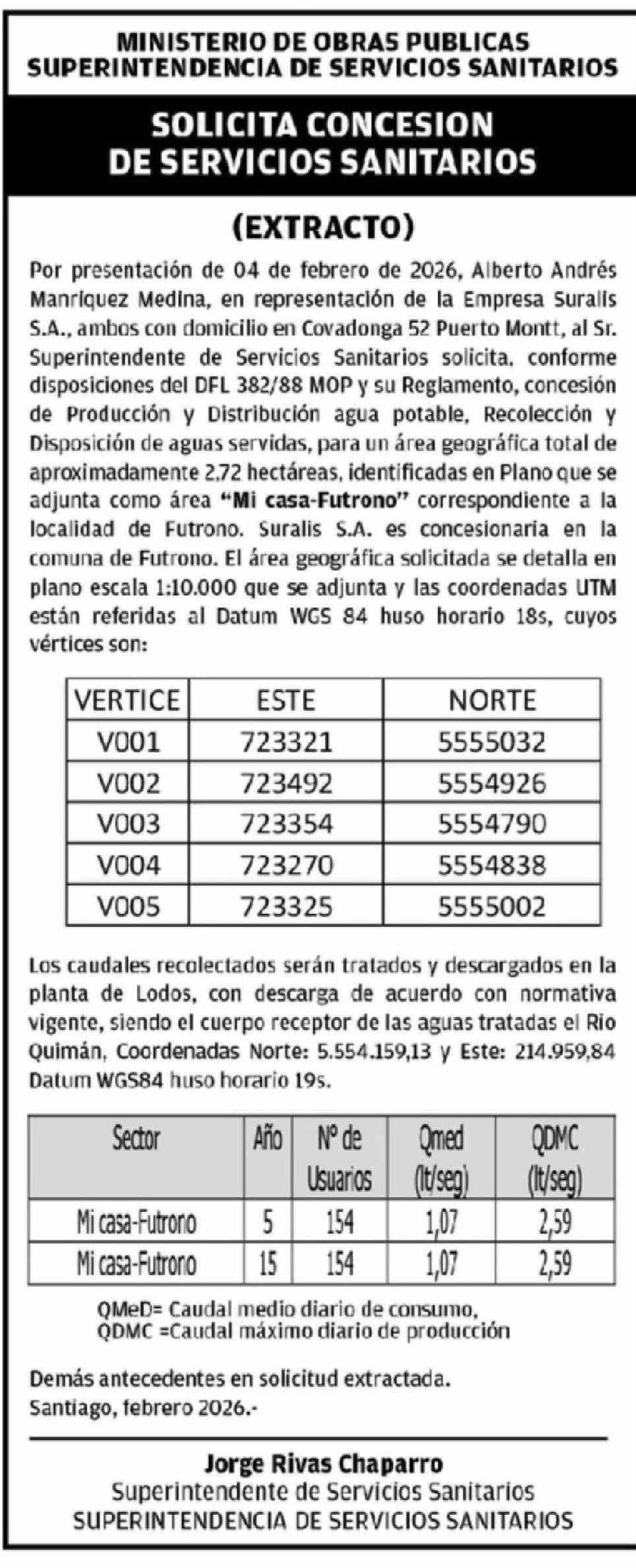 Extractos: MINISTERIO DE OBRAS PUBLICAS SUPERINTENDENCIA DE SERVICIOS SANITARIOS SOLICITA CONCESION DE SERVICIOS SANITARIOS 15-04-2026 Diario Austral Región de Los Ríos |