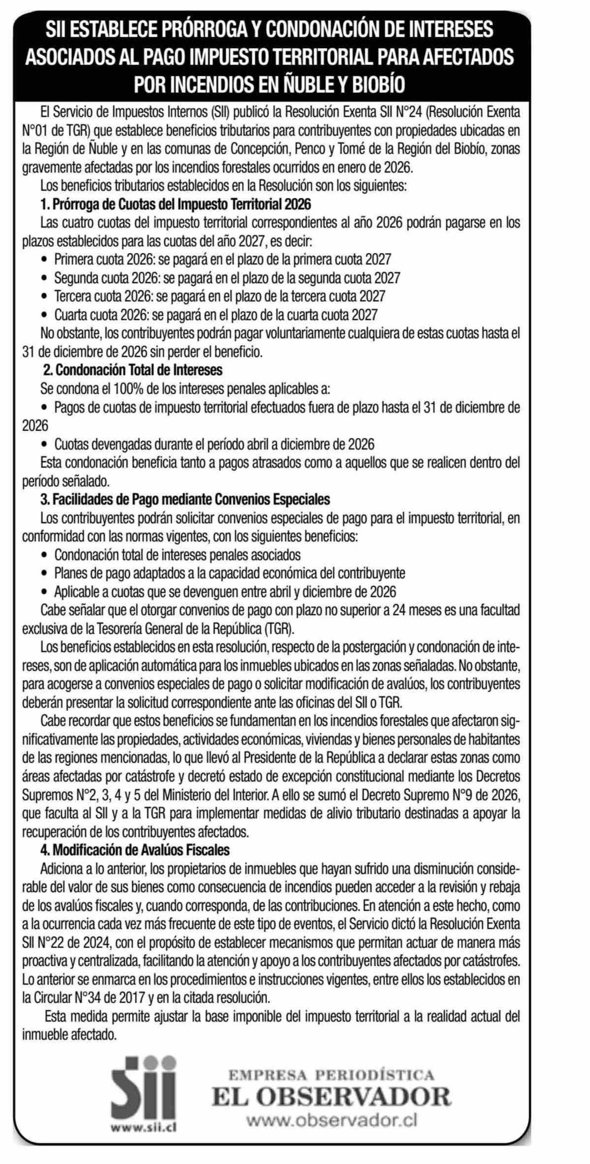 ASOCIADOS AL PAGO IMPUESTO TERRITORIAL PARA AFECTADOSI POR INCENDIOS EN NUBLE Y BIOBÍO 23-02-2026 El Observador Vespertino |