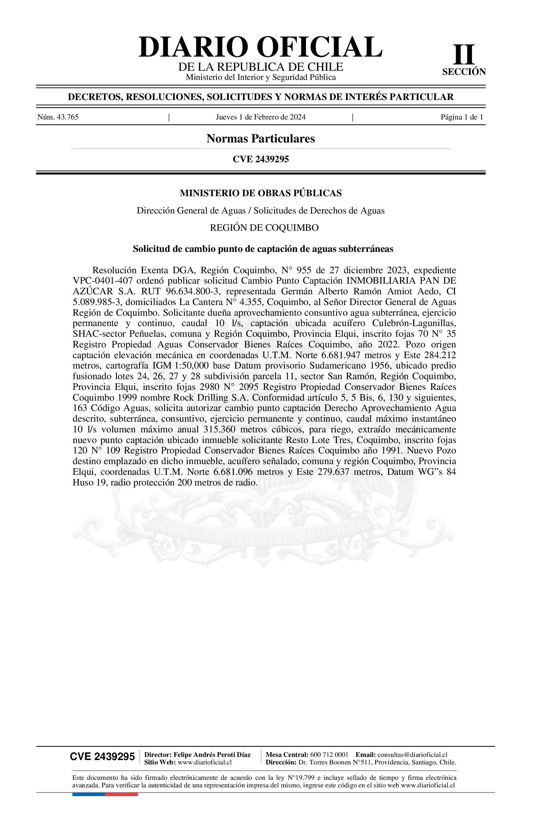 Ministerio de Obras Públicas Solicitud de Cambio Punto de Captación de Aguas Subterráneas 01-02-2024 Diario Oficial Edición Electrónica |
