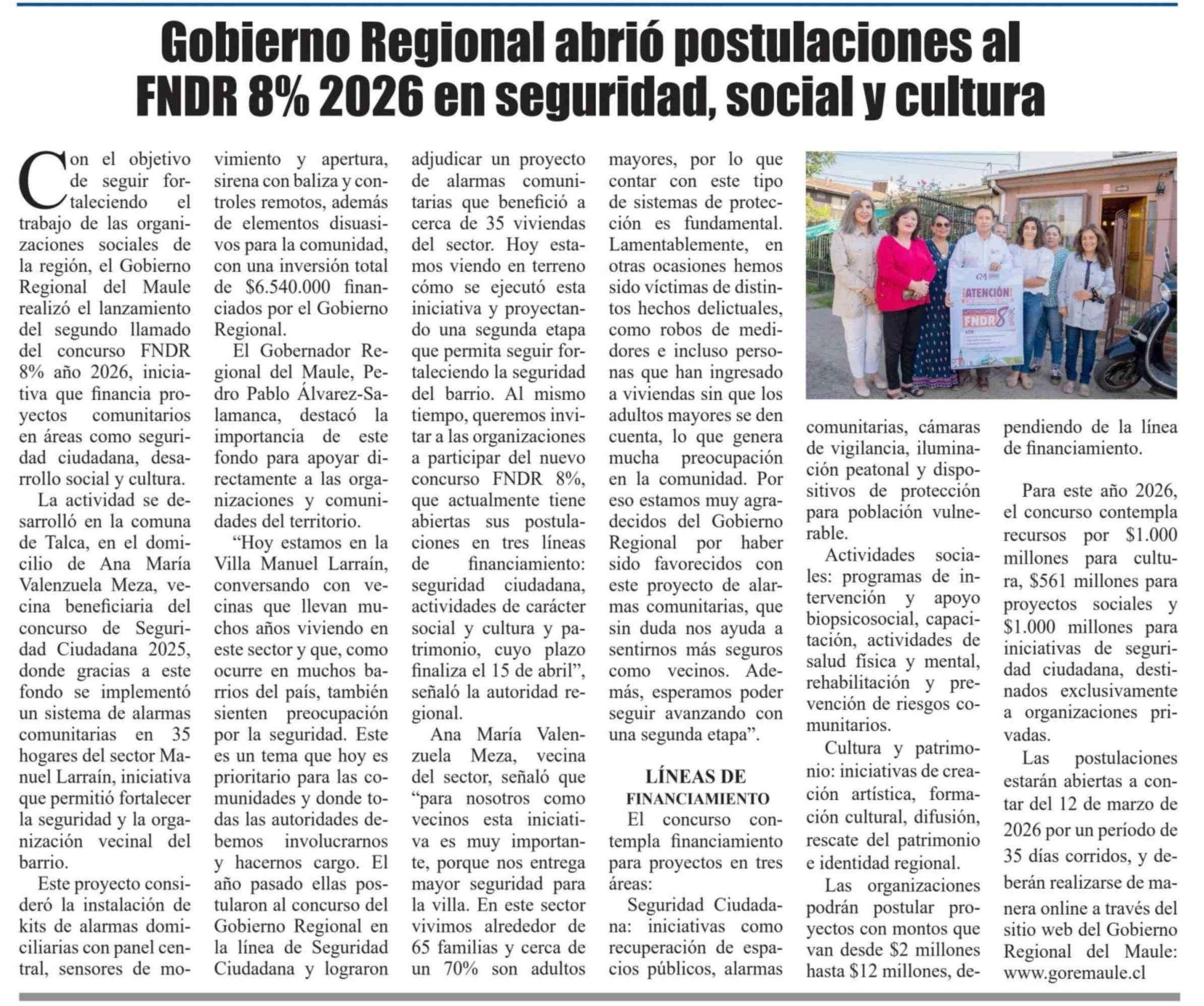Gobierno Regional abrió postulaciones al FNDR 8% 2026 en seguridad, social y cultura 14-03-2026 El Heraldo |
