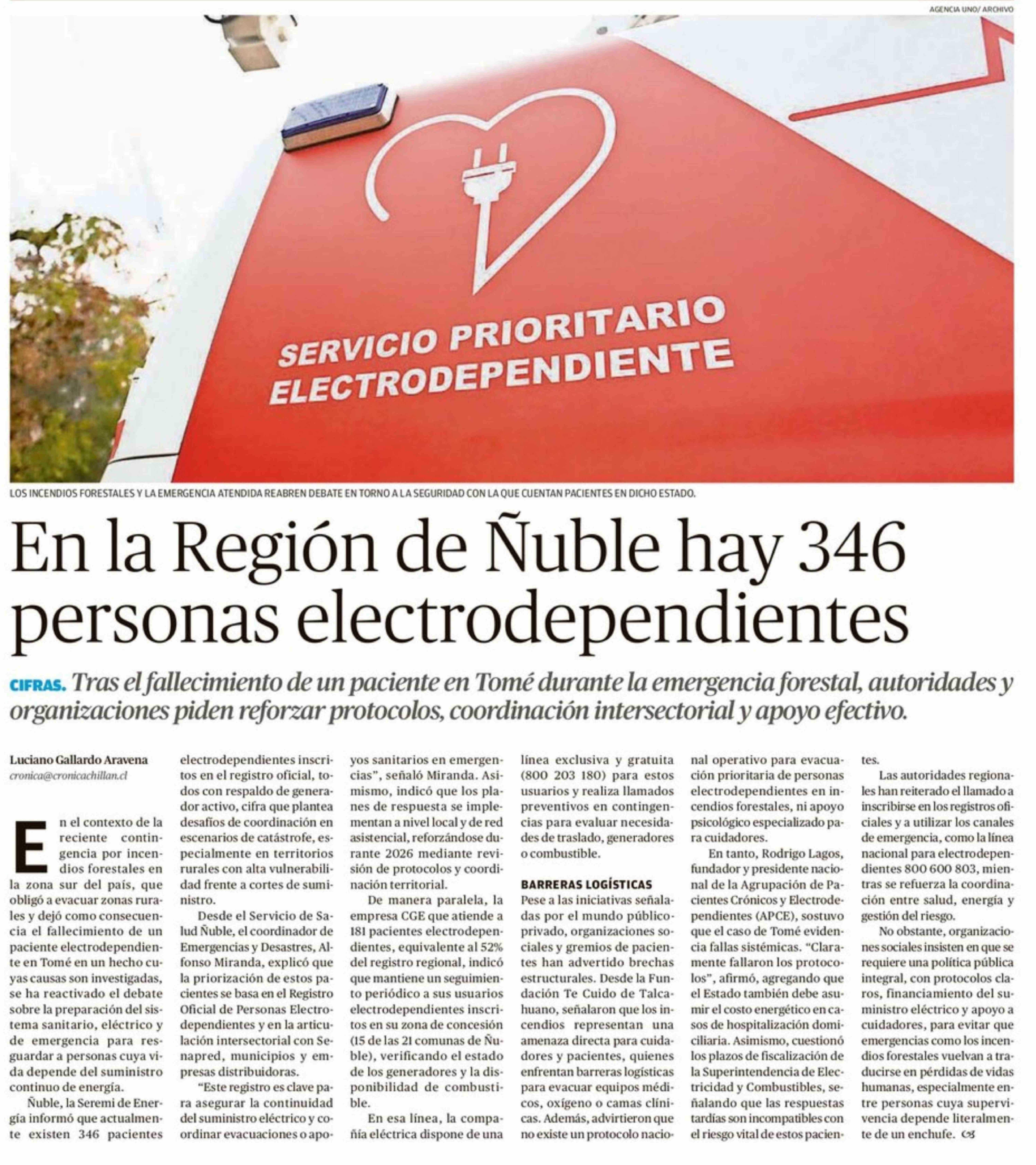 En la Región de Ñuble hay 346 personas electrodependientes 04-02-2026 Crónica de Chillán |