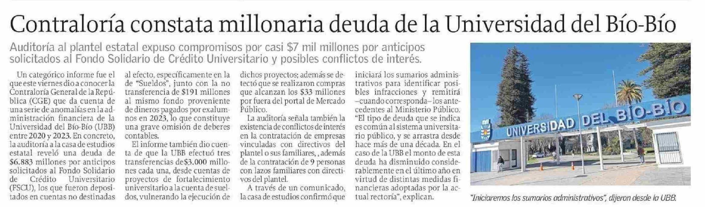 Contraloría constata millonaria deuda de la Universidad del Bío-Bío 31-05-2025 El Sur |