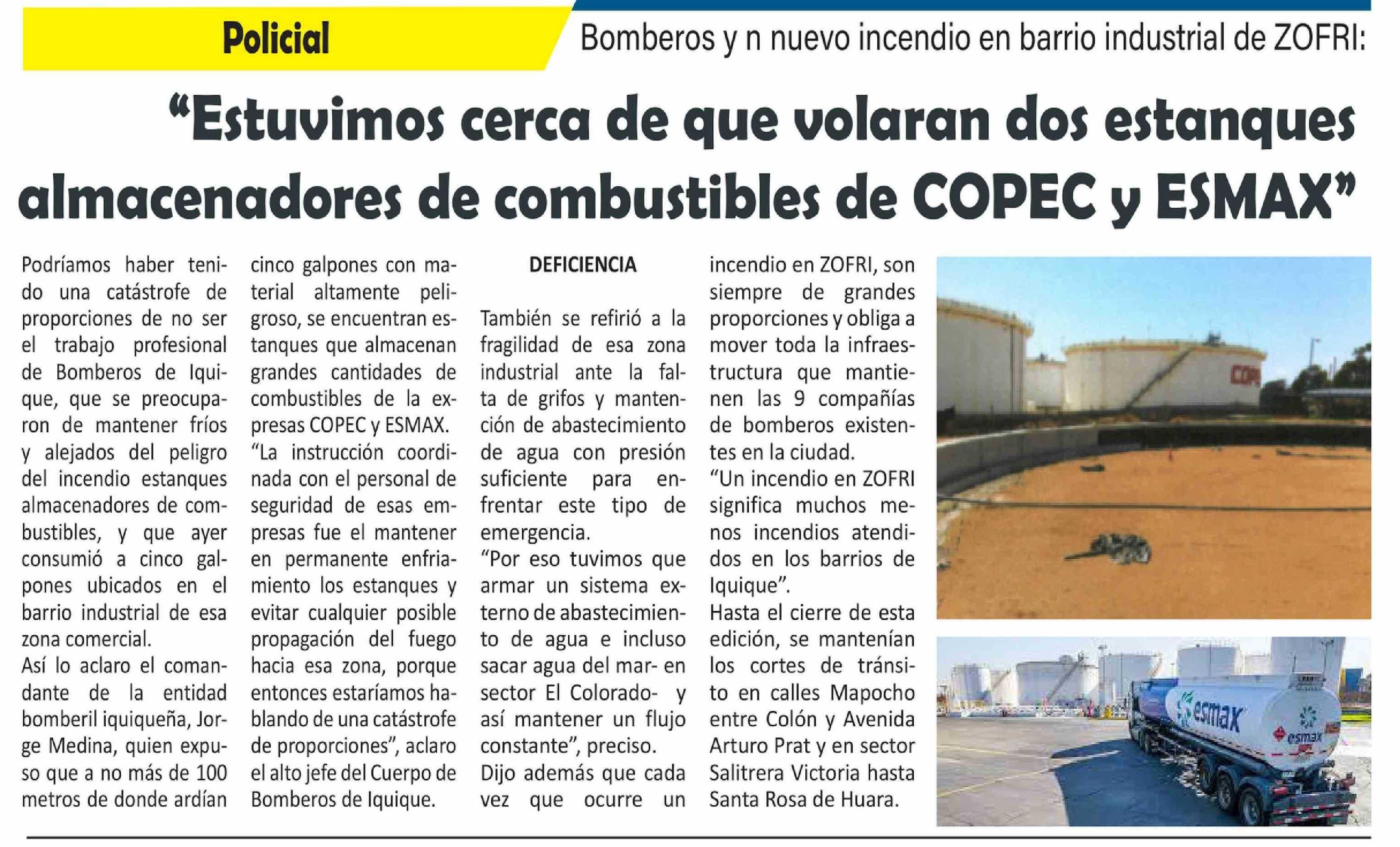| Título: | "Estuvimos cerca de que volaran dos estanques almacenadores de combustibles de COPEC y ESMAX" |