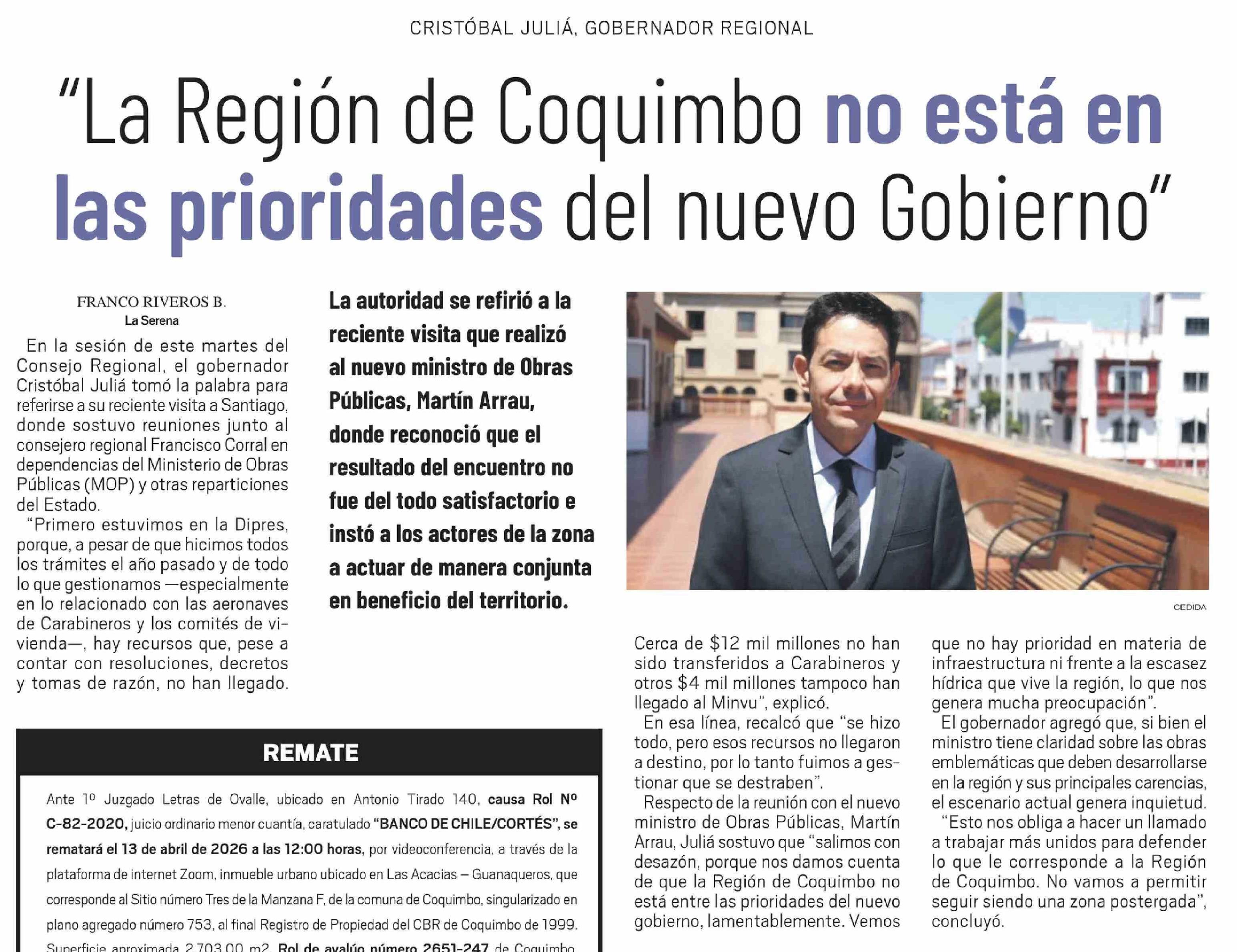 "La Región de Coquimbo no está en las prioridades del nuevo Gobierno" 25-03-2026 El Ovallino |