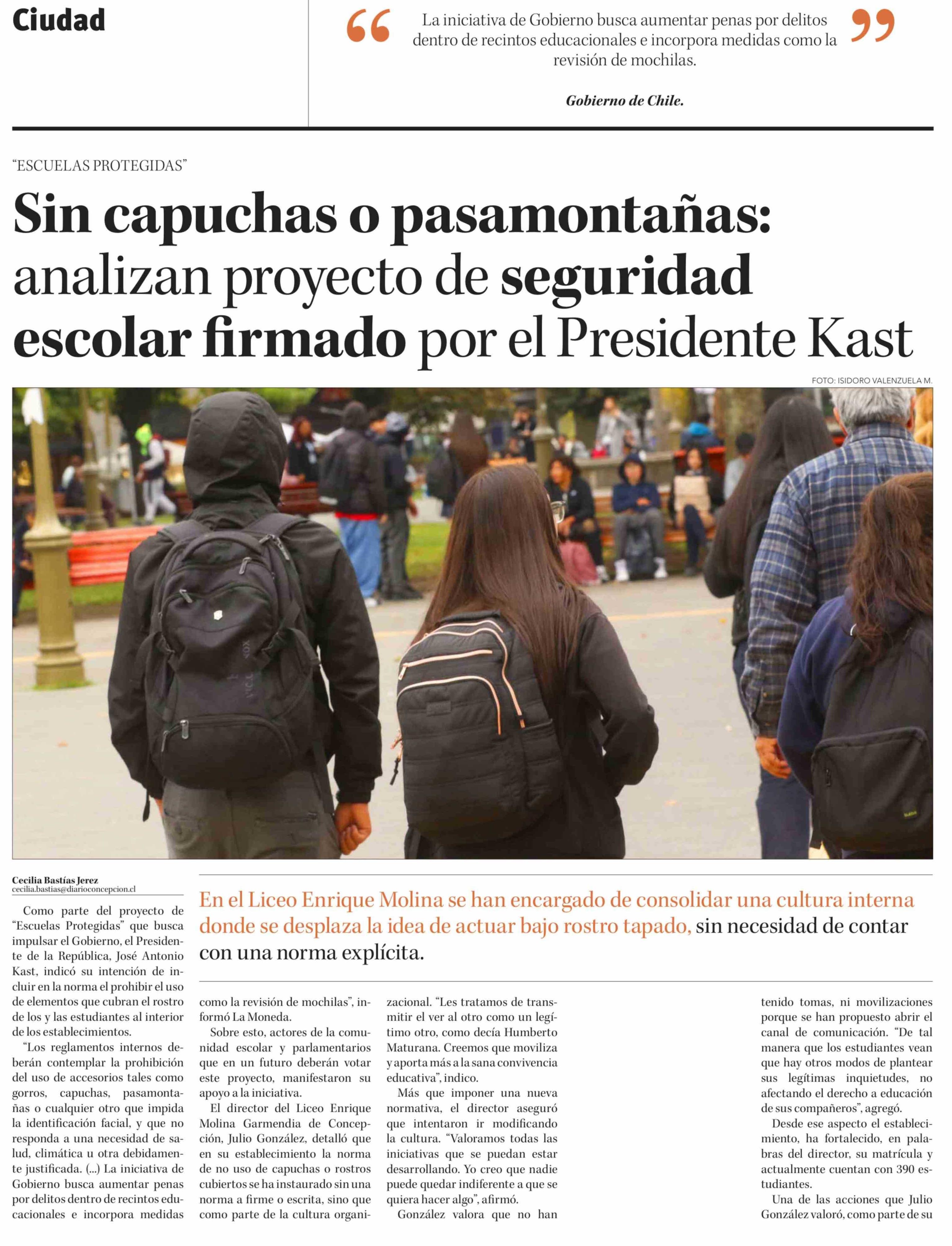 Título: Sin capuchas o pasamontañas: analizan proyecto de seguridad escolar firmado por el Presidente Kast