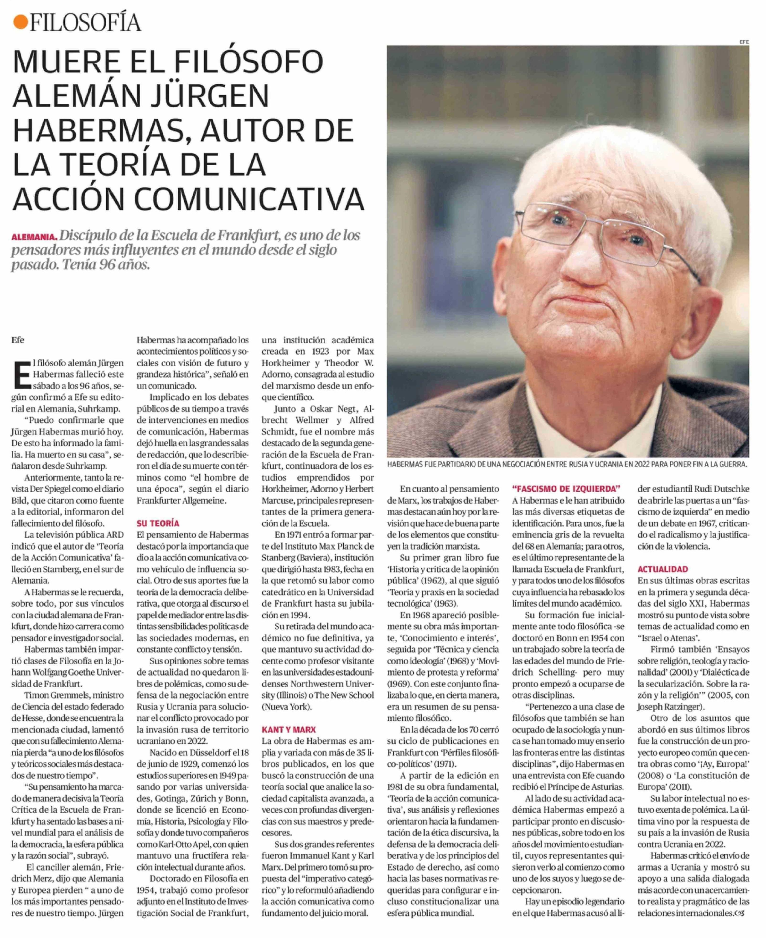 Título: MUERE EL FILÓSOFO ALEMÁN JÜRGEN HABERMAS, AUTOR DE LA TEORÍA DE LA ACCIÓN COMUNICATIVA
