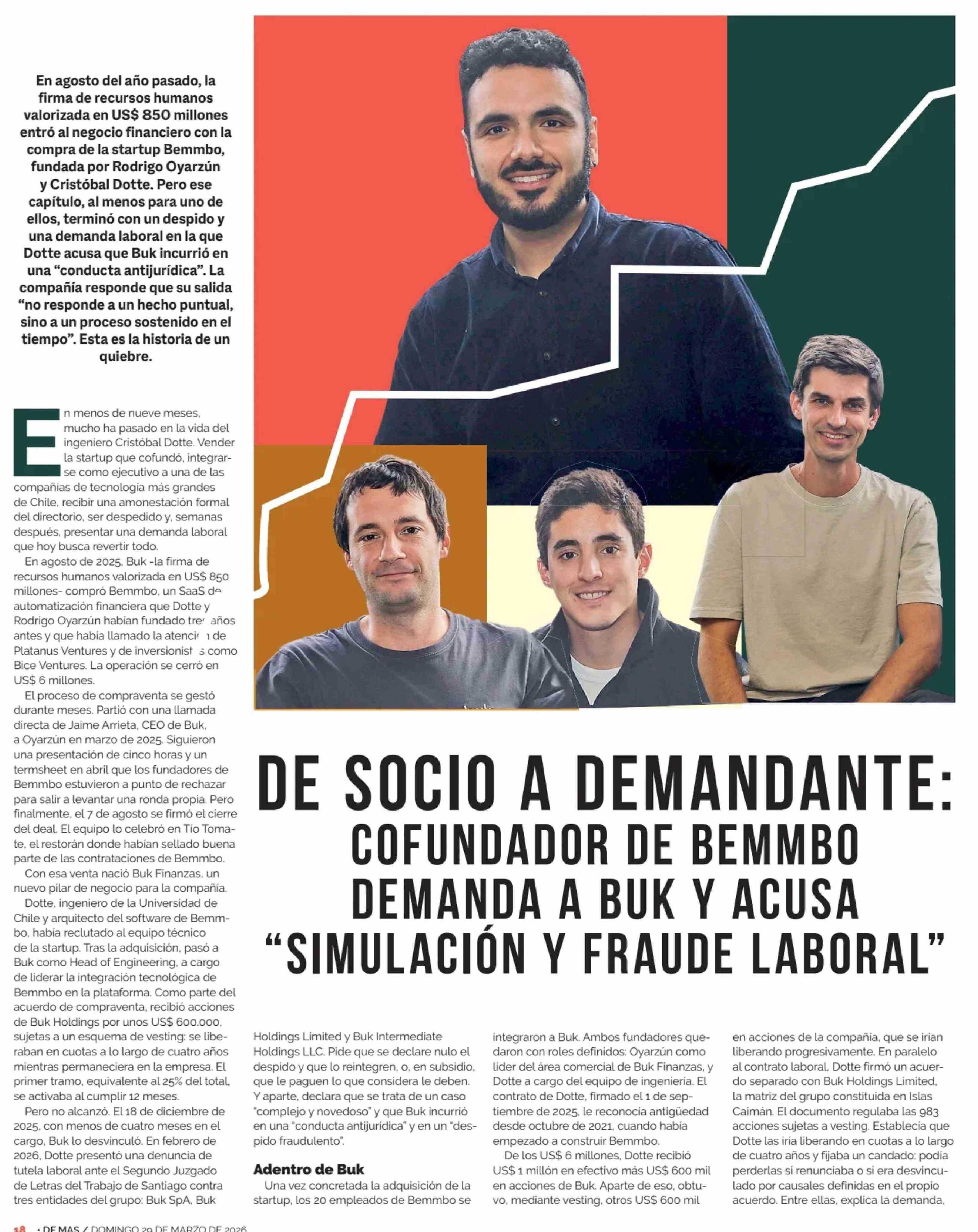 DE SOCIO A DEMANDANTE: COFUNDADOR DE BEMMBO DEMANDA A BUK Y ACUSA "SIMULACIÓN Y FRAUDE LABORAL" 29-03-2026 Diario Financiero |