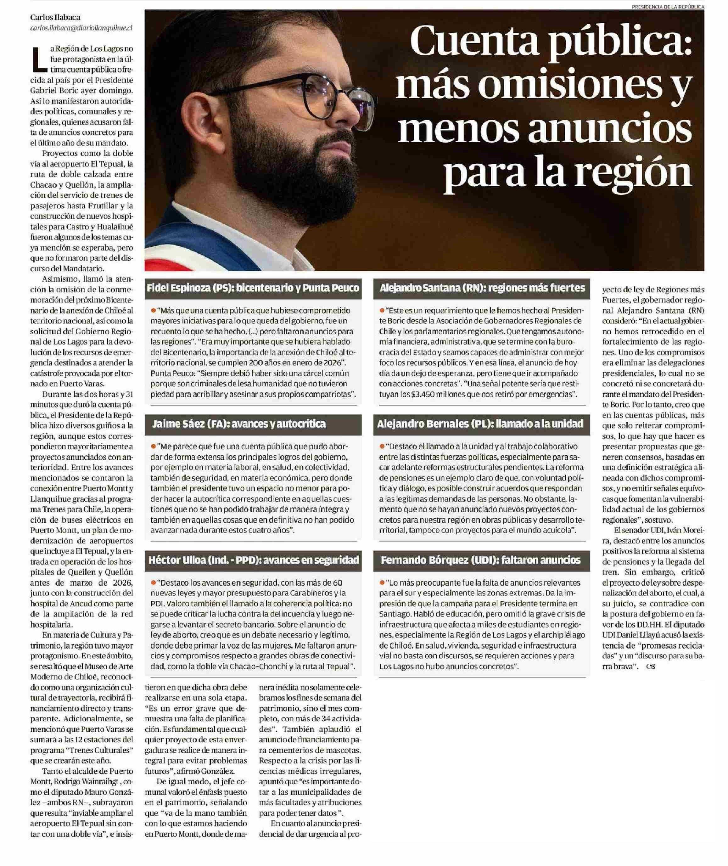 Cuenta pública: más omisiones y menos anuncios para la región 02-06-2025 El Austral de Osorno |