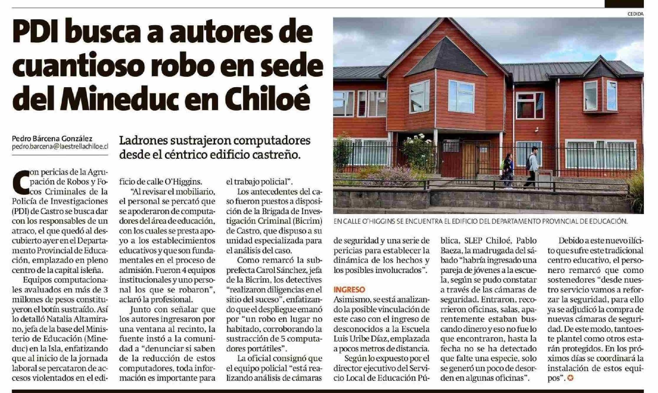 Título: PDI busca a autores de cuantioso robo en sede del Mineduc en Chiloé
