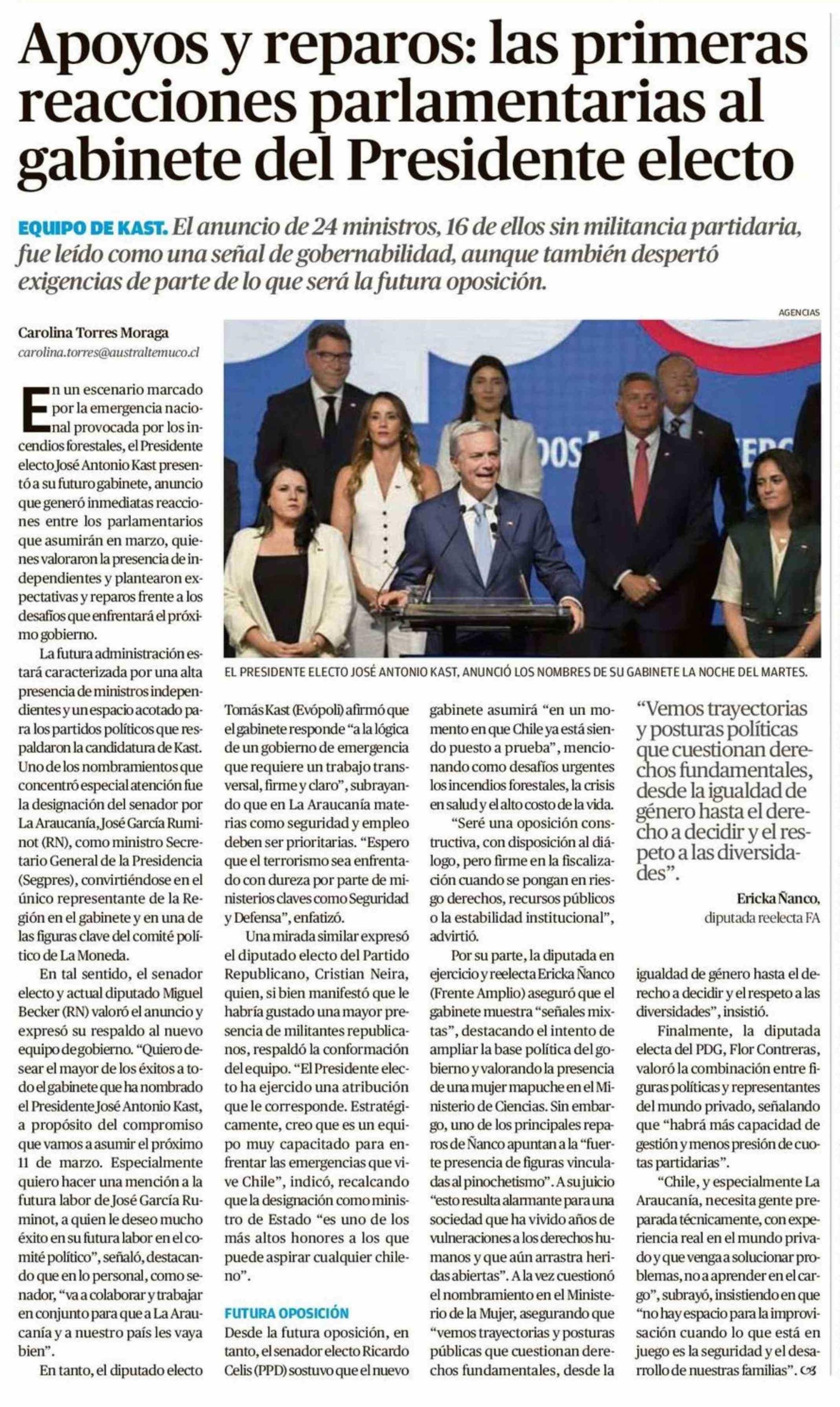 Apoyos y reparos: las primeras reacciones parlamentarias al gabinete del Presidente electo 22-01-2026 El Austral de la Araucanía |