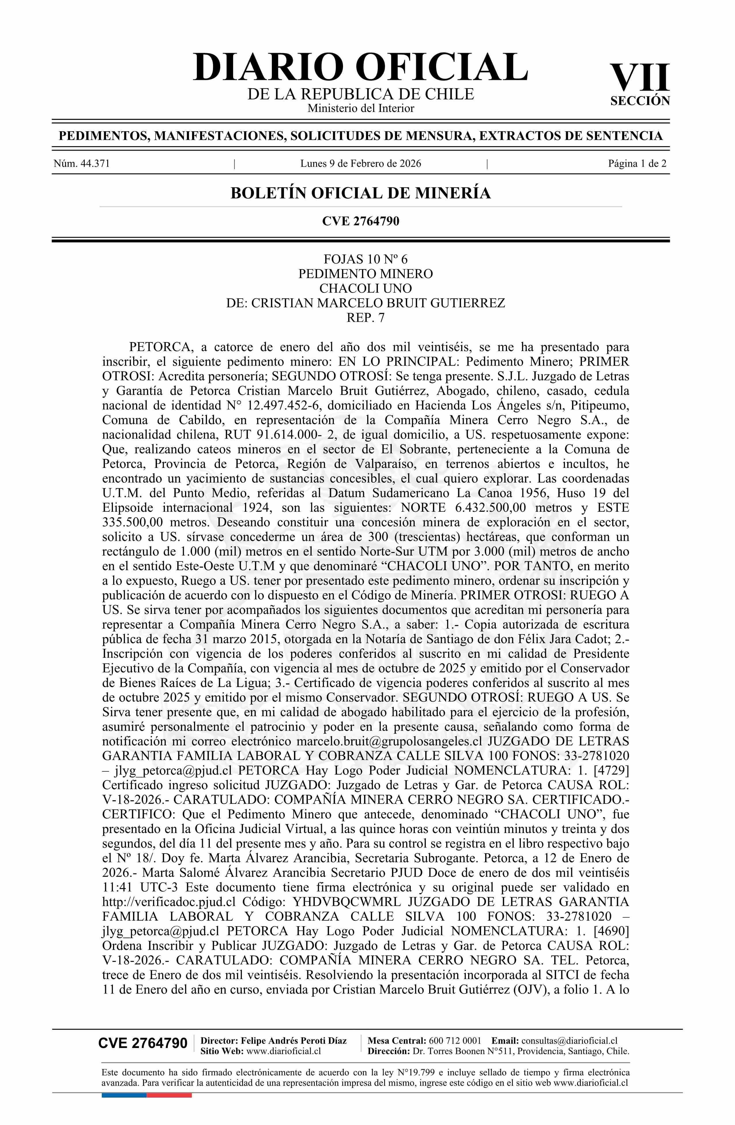 CHACOLI UNO / Bruit Gutiérrez Cristián Marcelo 09-02-2026 DIARIO OFICIAL CHILE - BOLETÍN OFICIAL DE MINERÍA |