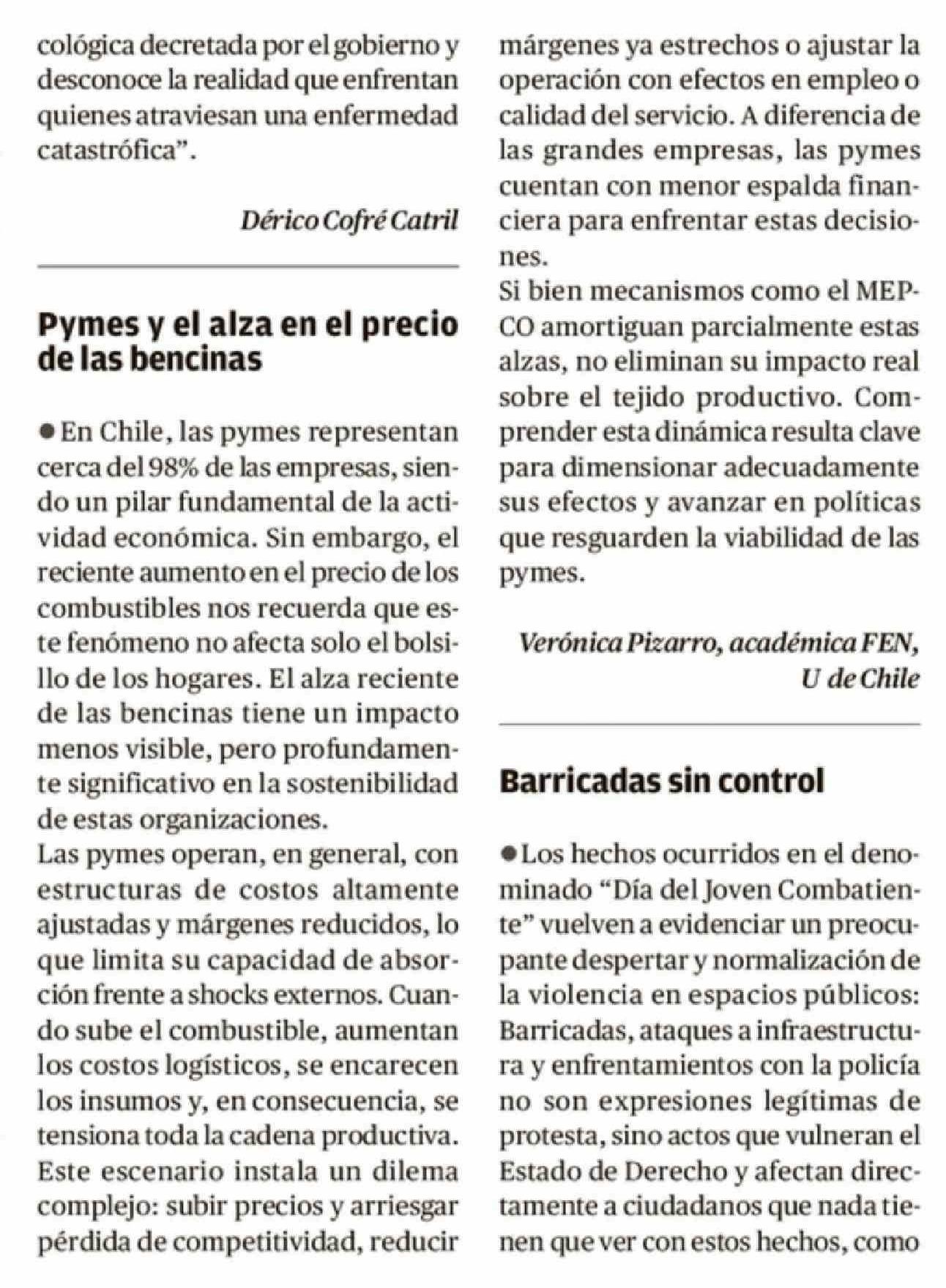 Cartas: Pymes y el alza en el precio de las bencinas 02-04-2026 Crónica de Chillán |