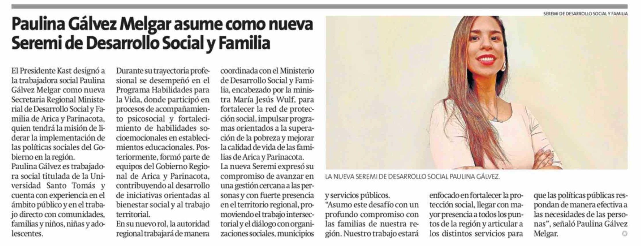 Paulina Gálvez Melgar asume como nueva Seremi de Desarrollo Social y Familia 01-04-2026 La Estrella de Arica |