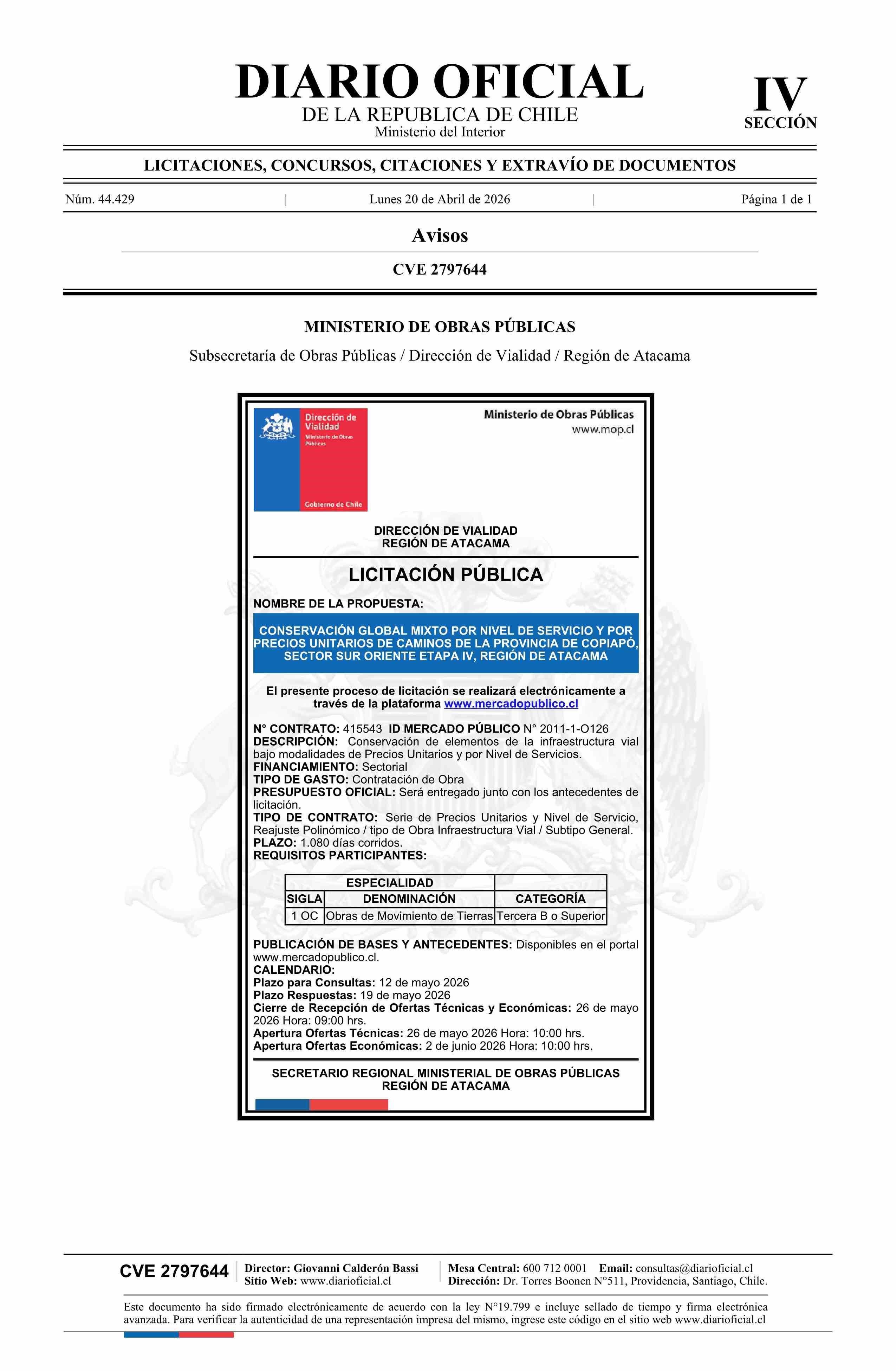 AVISO LICITACIONES: Conservación Global Mixto por Nivel de Servicio y por Precios Unitarios de Caminos de la Provincia de Copiapó, Sector Sur Oriente Etapa IV, Región de Atacama 20-04-2026 Diario Oficial Edición Electrónica |