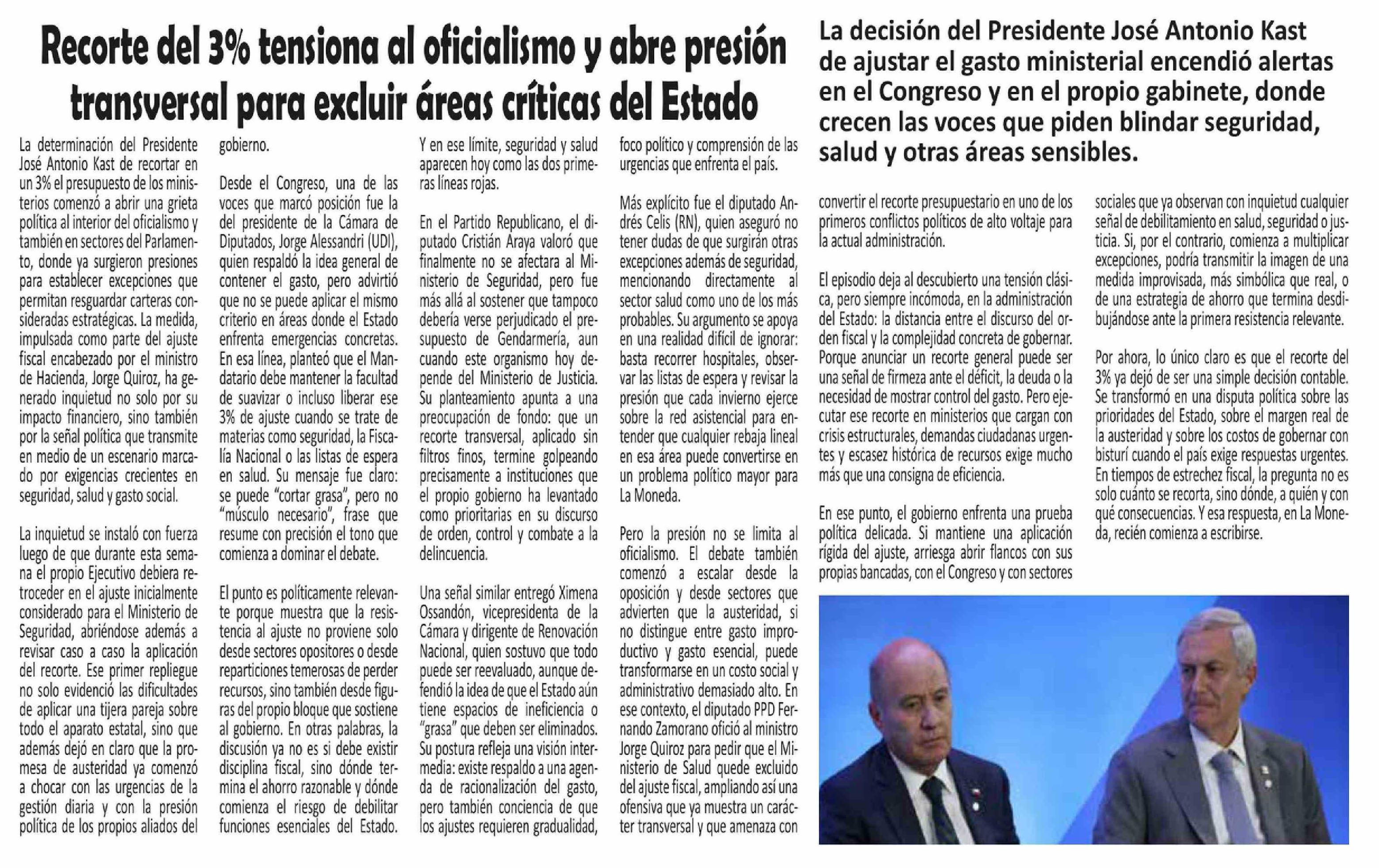 | Título: | Recorte del 3% tensiona al oficialismo y abre presión transversal para excluir áreas críticas del Estado |