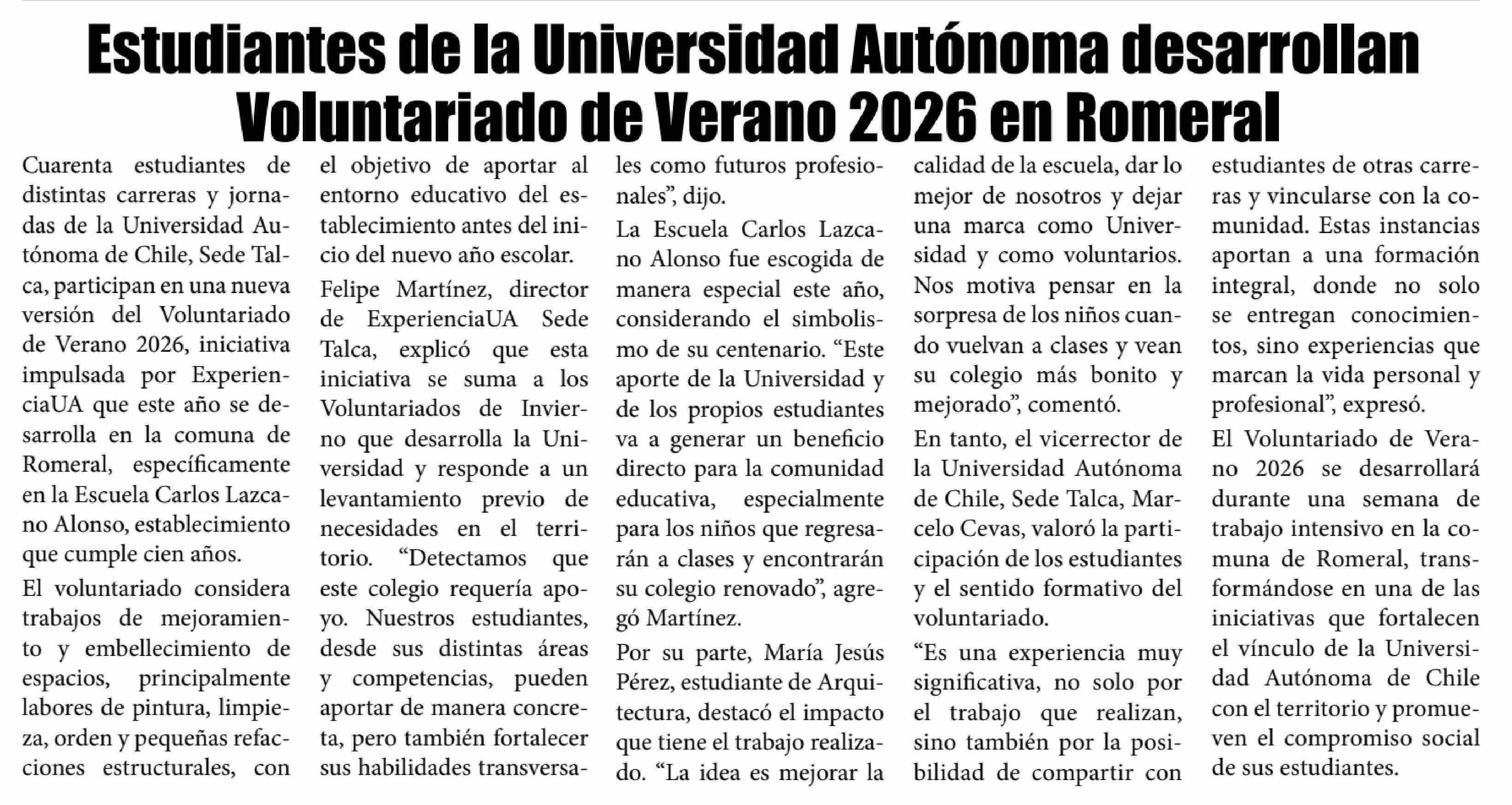 Estudiantes de la Universidad Autónoma desarrollan Voluntariado de Verano 2026 en Romeral 15-01-2026 El Lector |