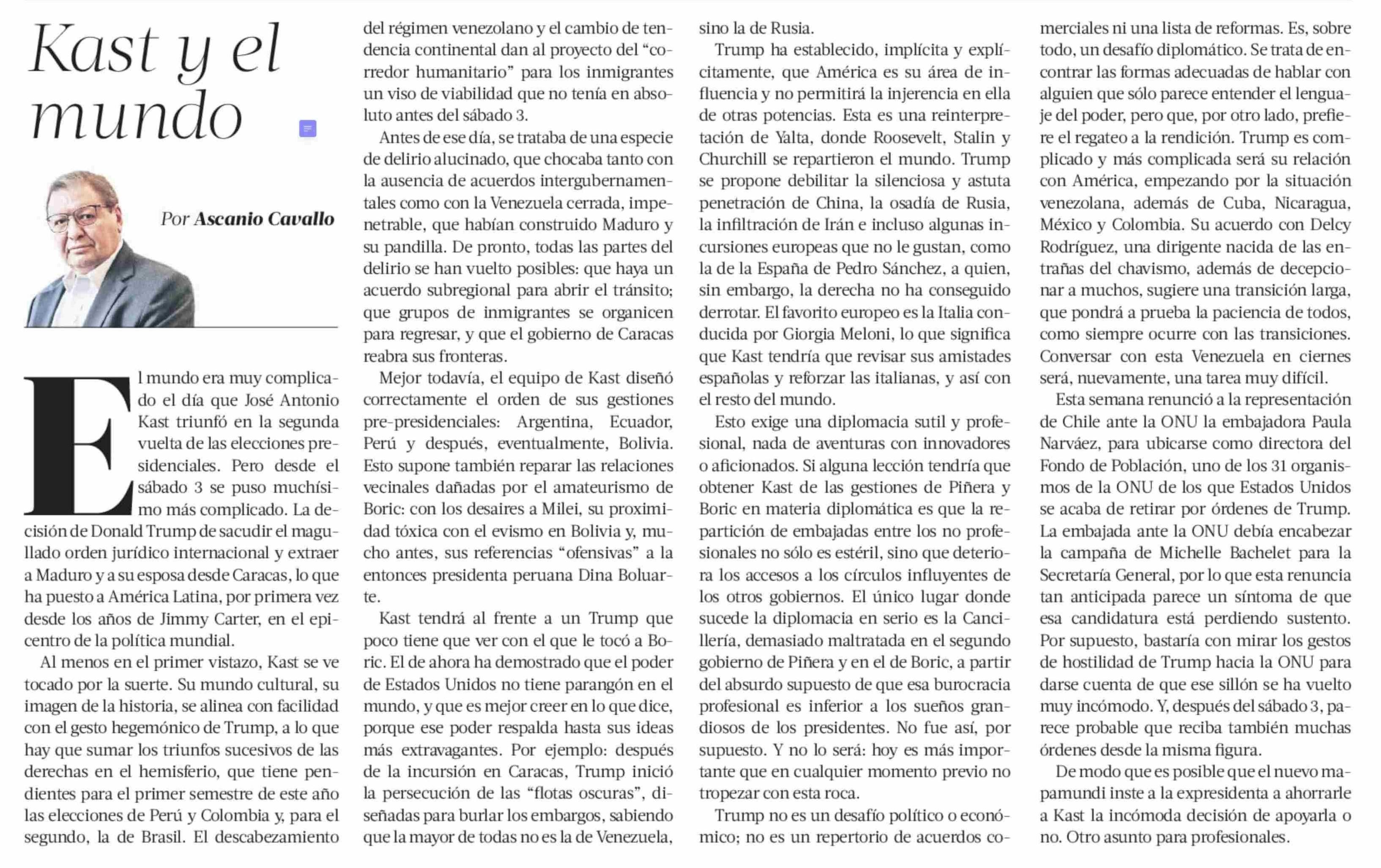 Columnas de Opinión: Kast y el mundo 11-01-2026 La Tercera |