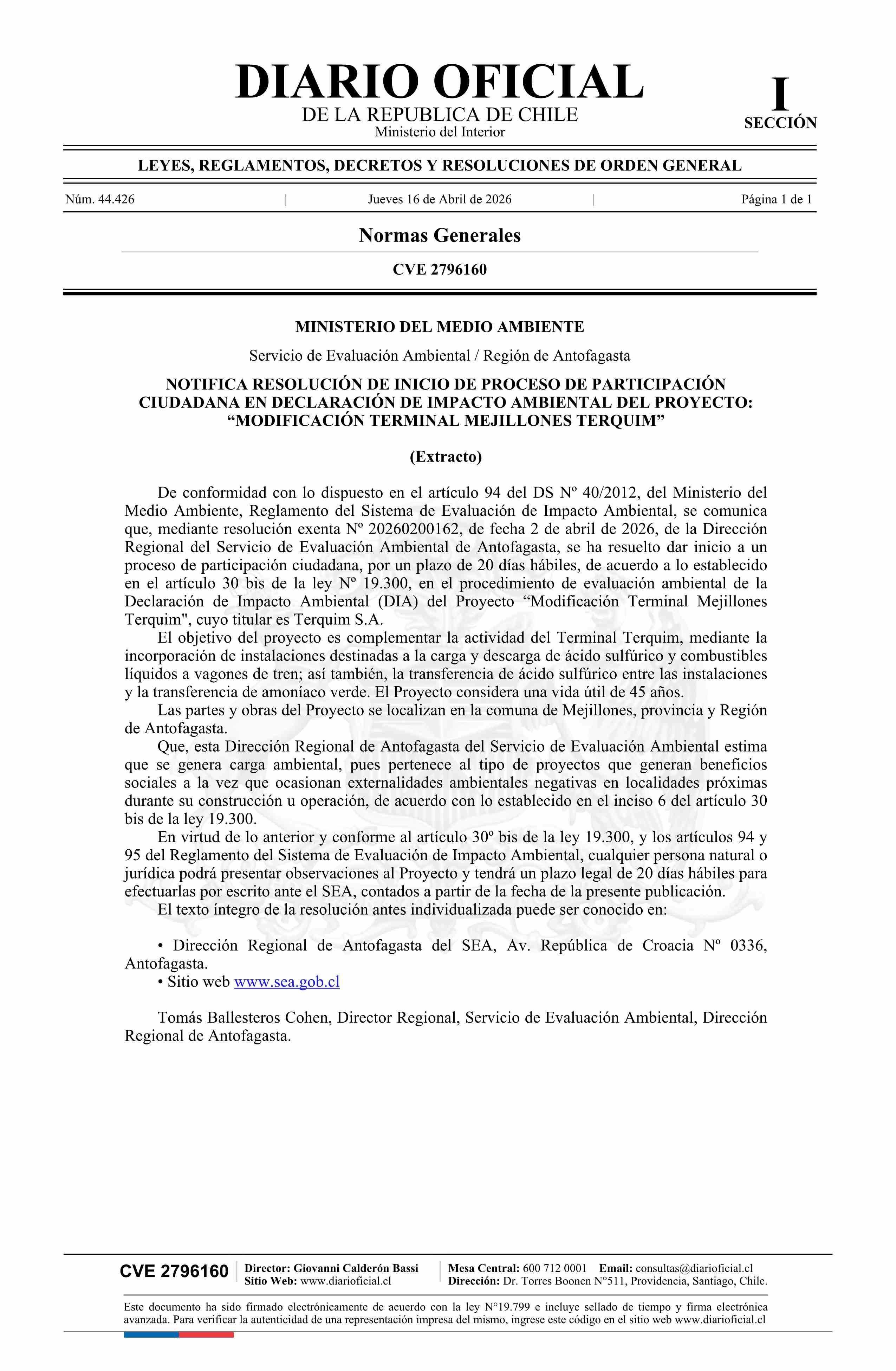 | Título: | Extracto de resolución exenta número 20260200162, de 2026.- Inicia proceso de participación ciudadana en Declaración de Impacto Ambiental del proyecto Modificación Terminal Mejillones Terquim |