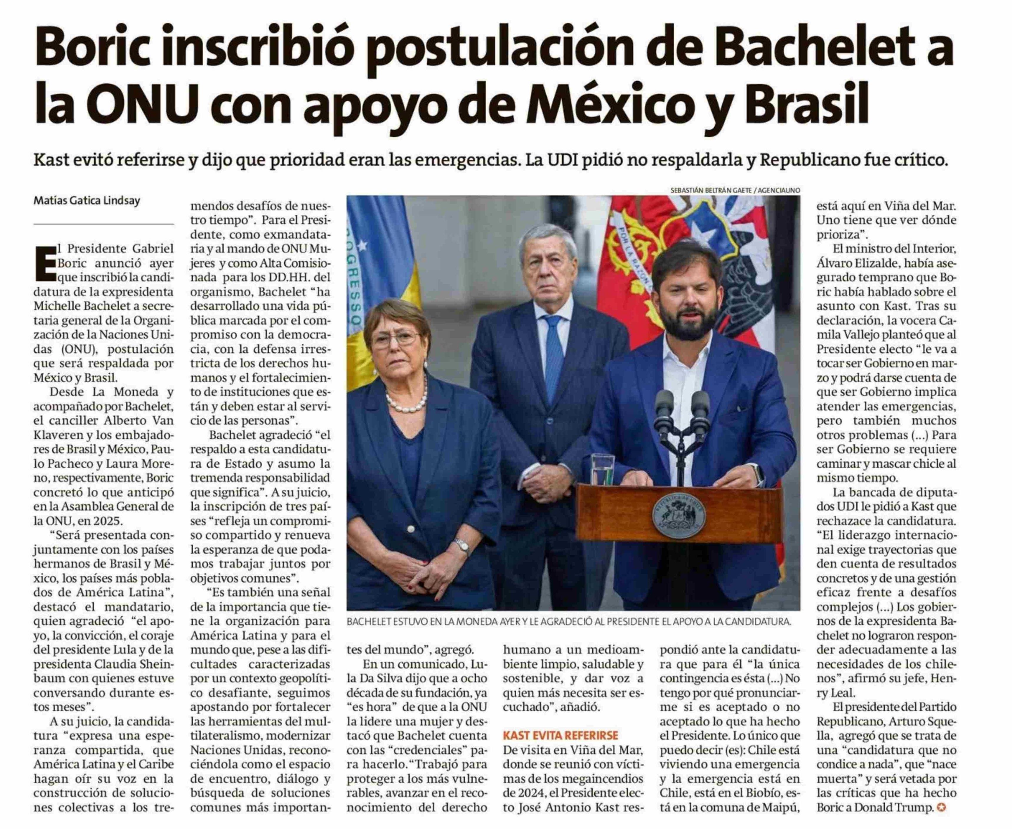 | Título: | Boric inscribió postulación de Bachelet a la ONU con apoyo de México y Brasil |