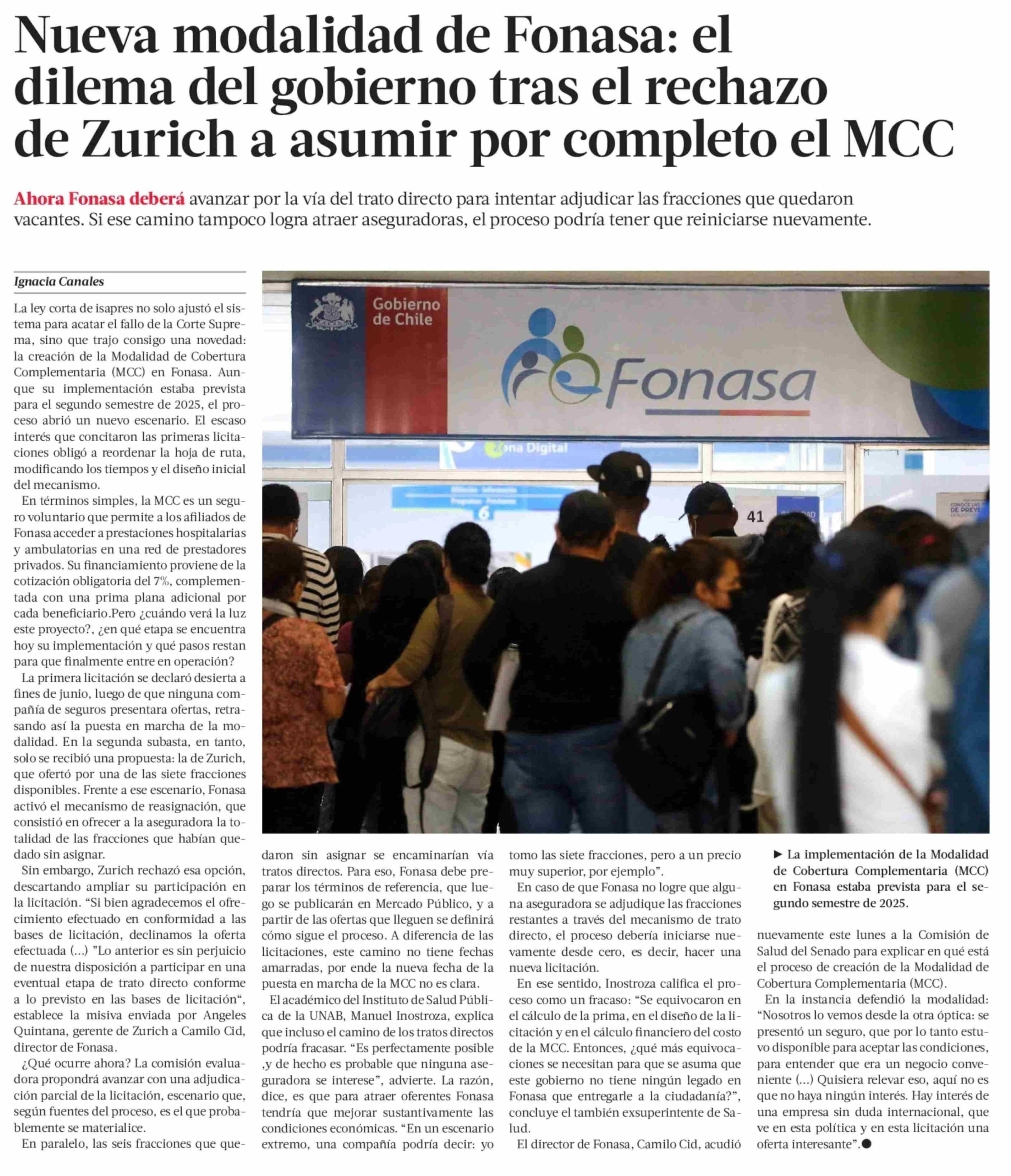 | Título: | Nueva modalidad de Fonasa: el dilema del gobierno tras el rechazo de Zurich a asumir por completo el MCC |