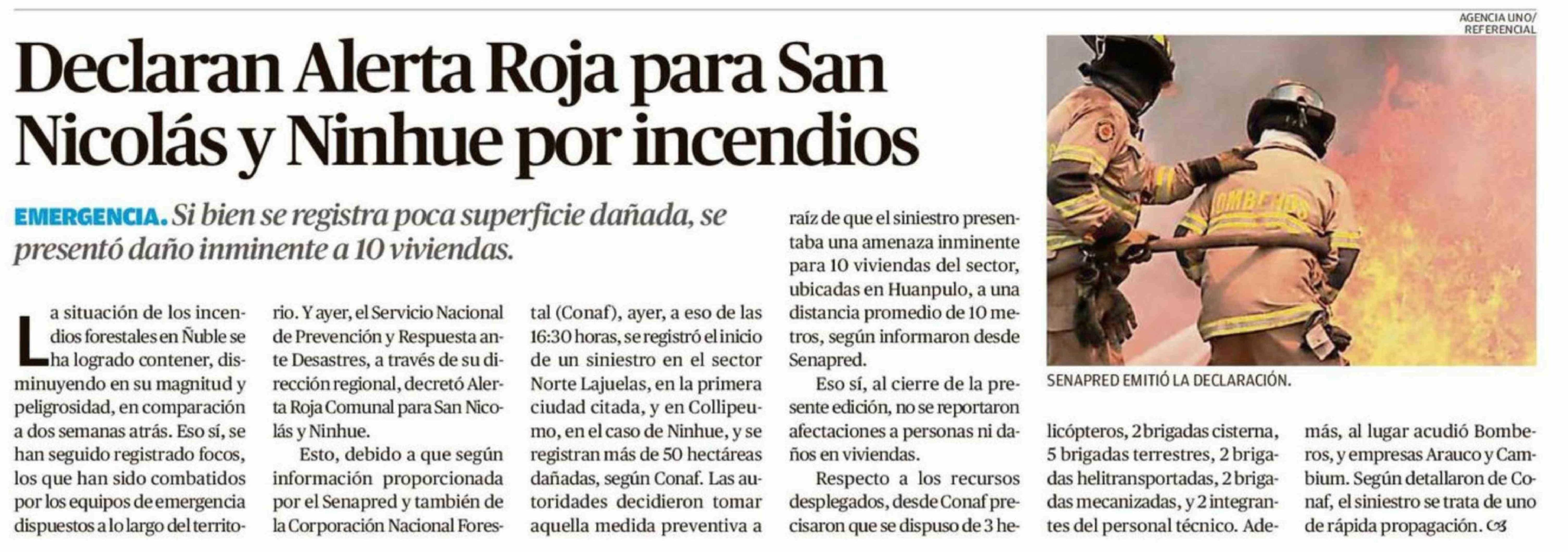 | Título: | Declaran Alerta Roja para San Nicolás y Ninhue por incendios |